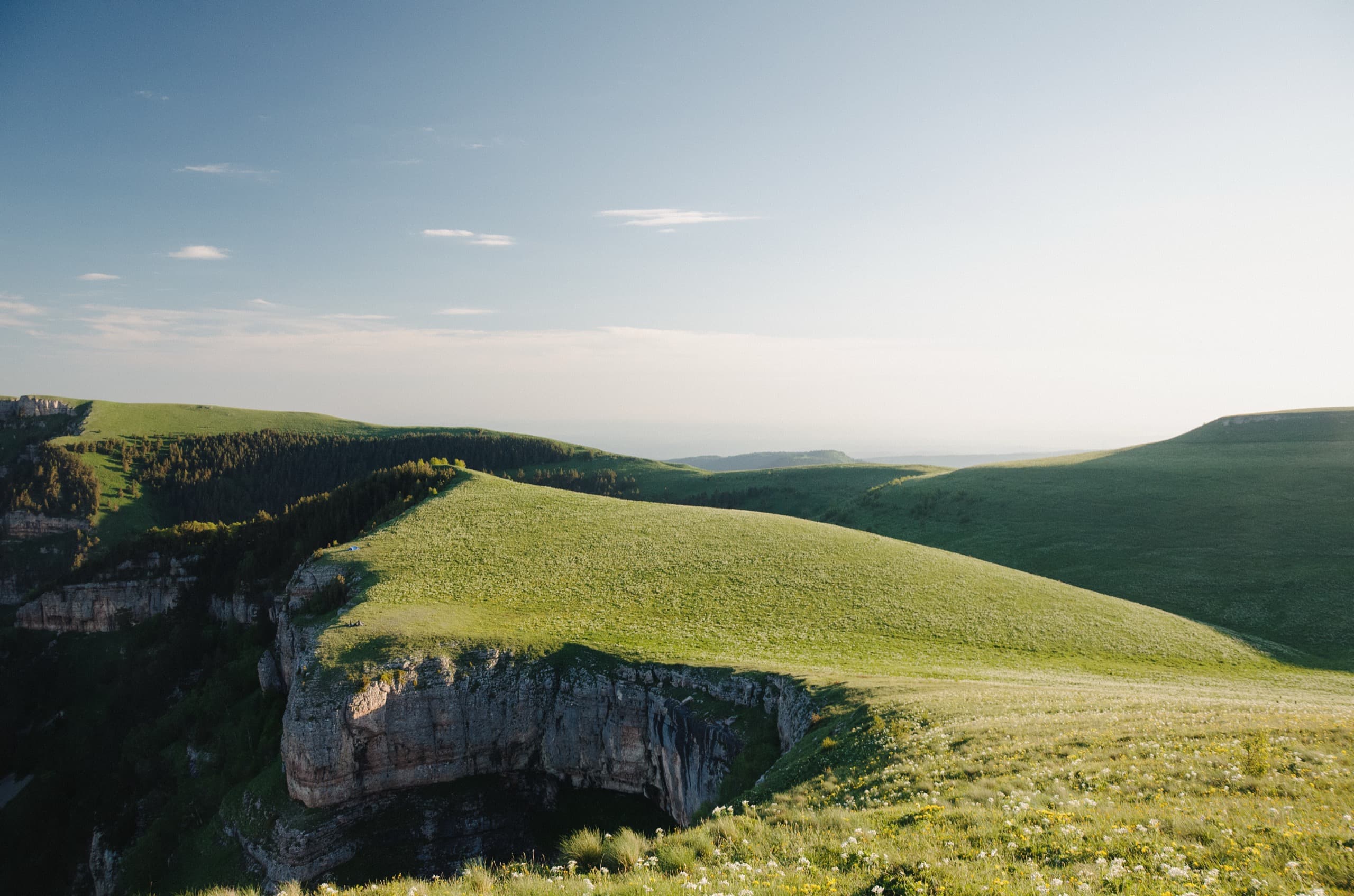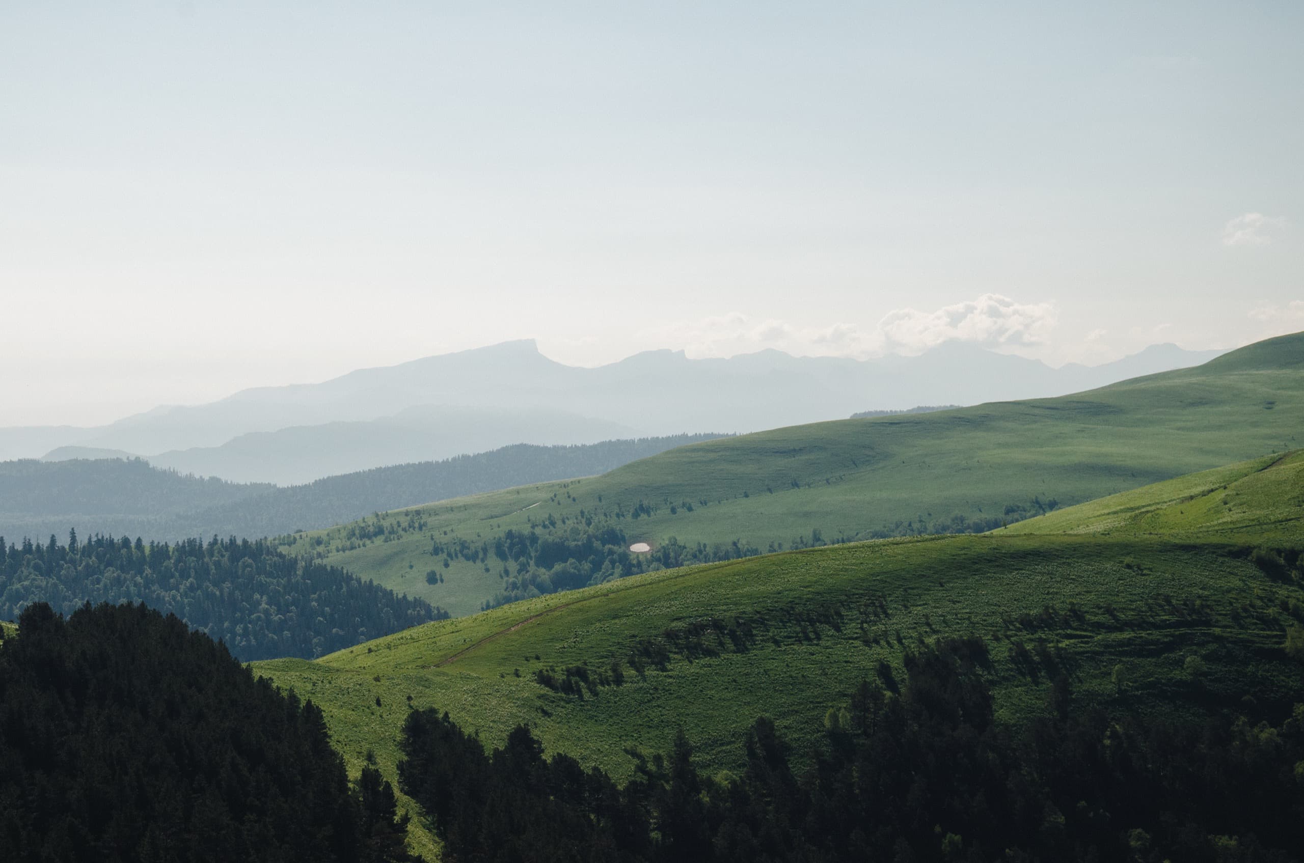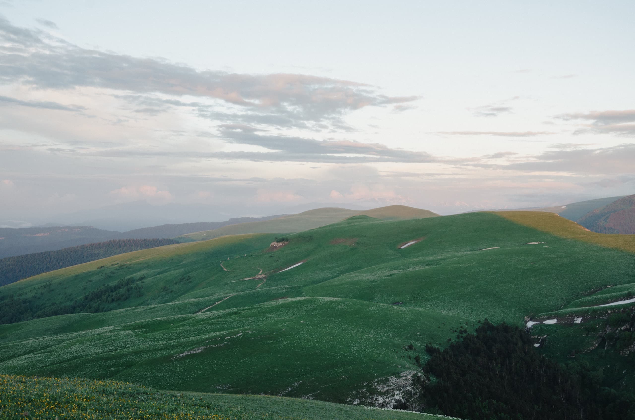 На мгновение по правую руку открылся хороший вид на Фишт-Оштеновский массив, но вскоре он скрылся за склонами горы Уриэль, которая с этой стороны выглядела невзрачным зелёным холмиком. За Уриэлью взору предстала равнина, как раз тот самый участок нагорья, который можно назвать плато. А за всем этим великолепием поднимались известные мне лишь по картам массивы Чугуша.