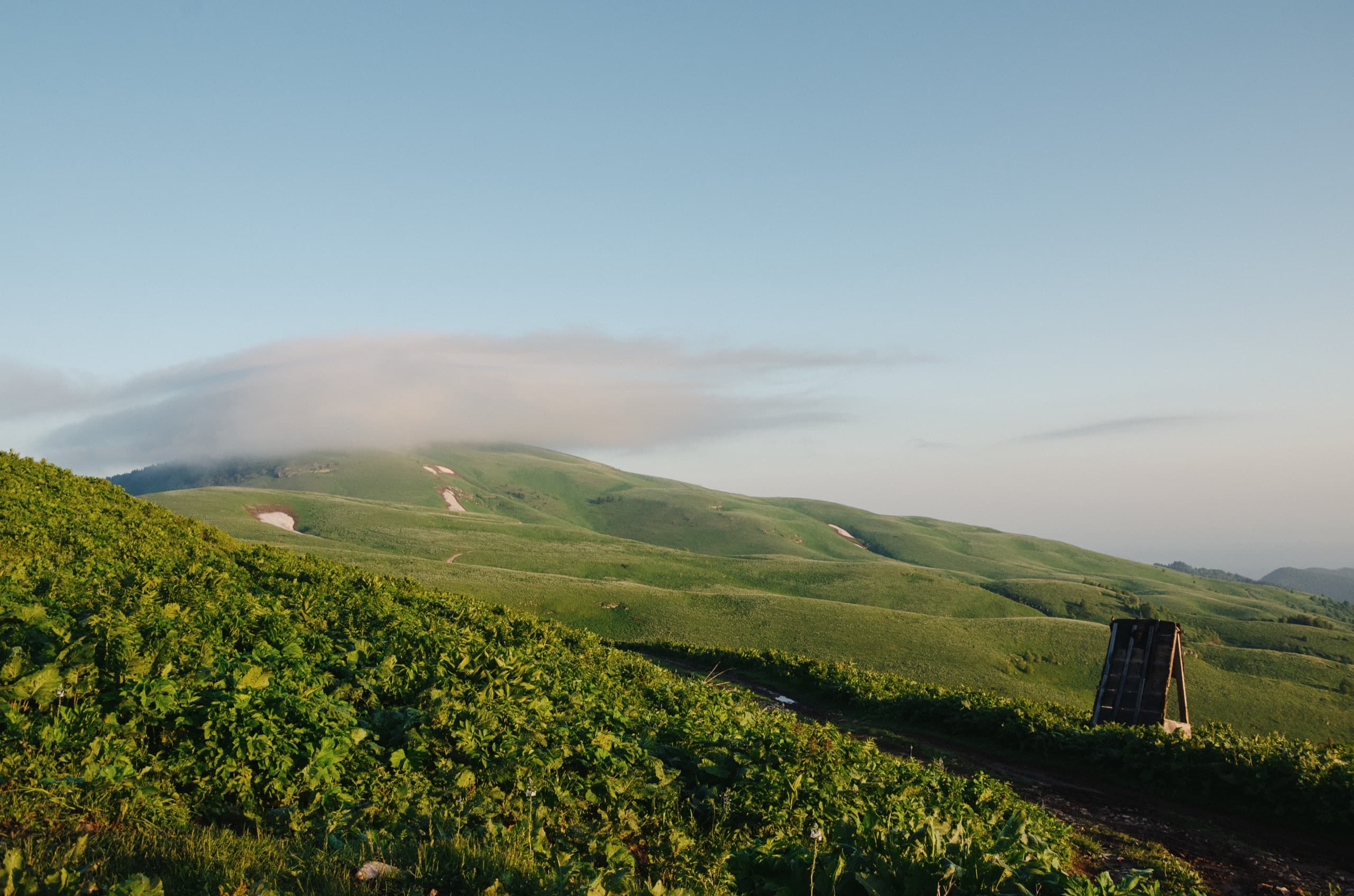 Со стороны коша троп к вершине нет. Поэтому я немного прошёлся по основной дороге и свернул в луга. Сперва трава была высокой и доставляла неудобства. Но с набором высоты это прошло. В каком-то месте будто невидимая граница прошла по лугу: ниже заросли, выше аккуратный невысокий альпийский ковёр, как будто газон.