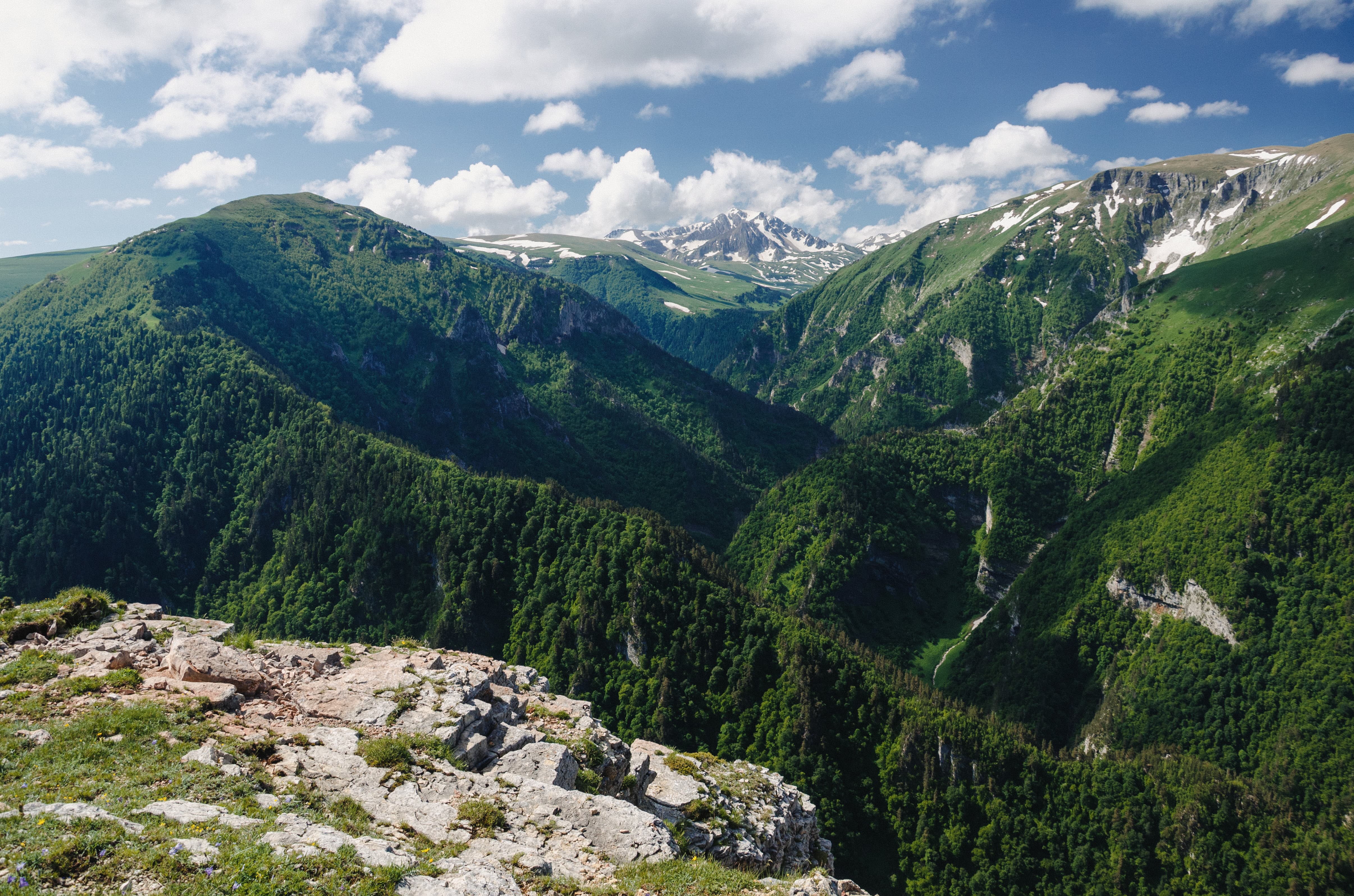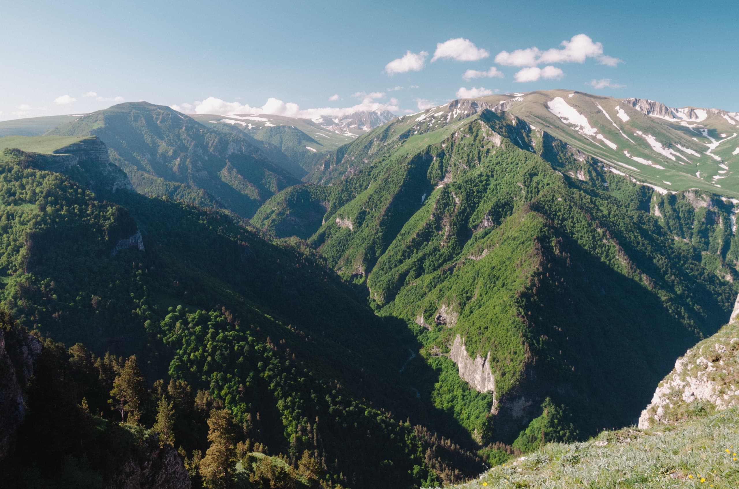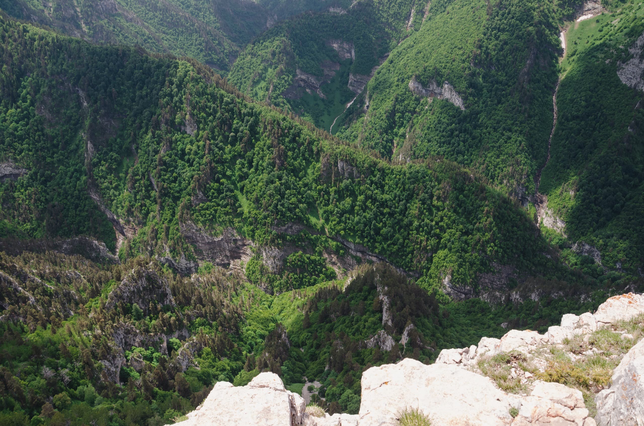 Фото 68. И ещё один вид на прекрасные далёкие вершины заповедника.Незаметно пересекли Мезмай-гору и вышли к краю хребта. Небольшой обрыв, высотой в несколько десятков метров, уводил к выположенному дну обширной долины. Вдали, в её сердце, виднелась черта русла Курджипс. Эта река берёт своё начало из-под склонов горы Абадзеш, и понемногу врезаясь в породу небольшим каньоном, убегает к посёлку Мезмай. Там река раздаётся широкой долиной, но лишь для того, чтобы собраться с силами и врезаться в горы мощнейшим Гуамским ущельем.