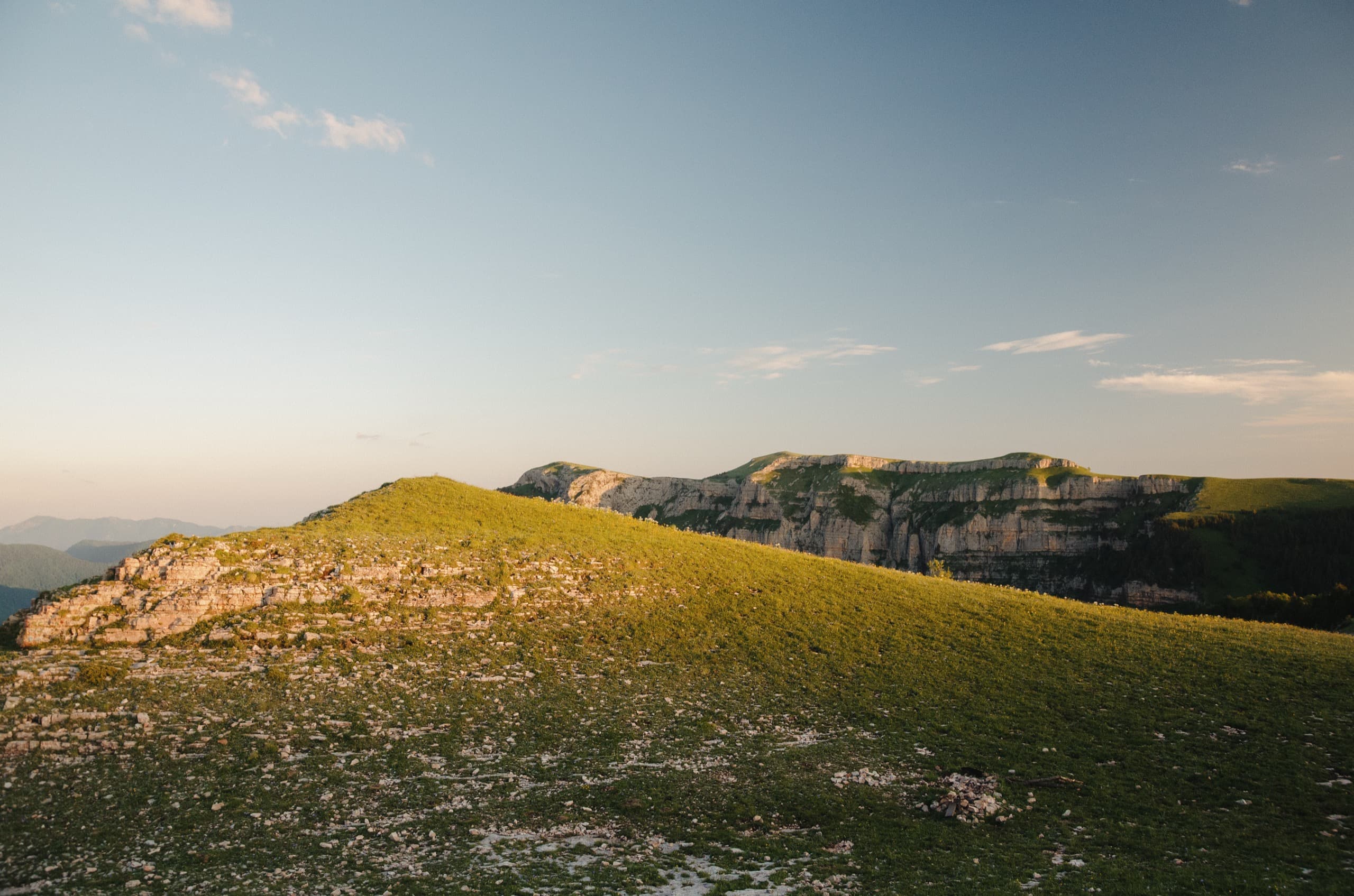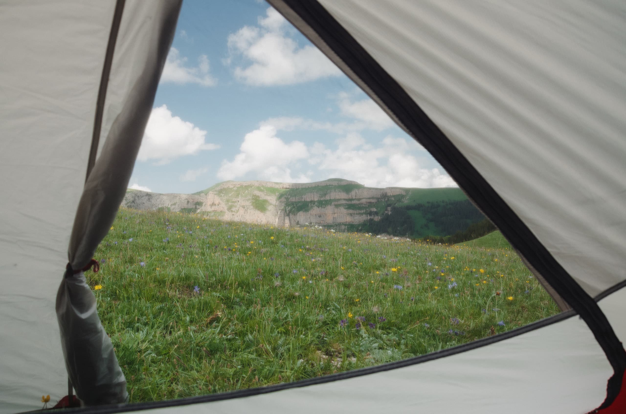 После фото звёзд снова залезли в спальники, но сон не шёл. С первой зарёй уже сидели с кружками чая и любовались разгорающимися склонами Оштена, Цицинского каньона и гигантским слизняком, смачно жующим травяной кустик.