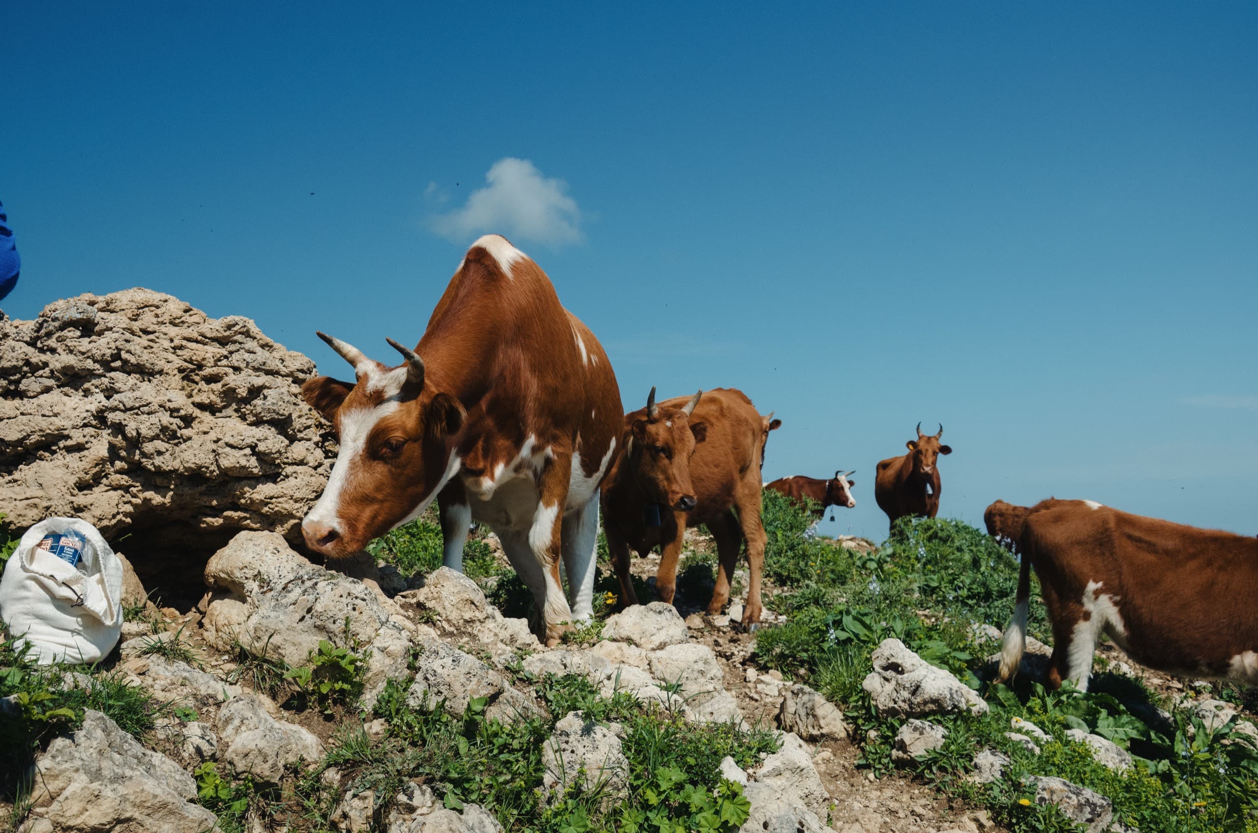 Как раз в это время подошло стадо коров и нас окружили десятки бурёнок. Коровки были миролюбивыми, но некоторые оказались чрезмерно любопытными. Виталик едва успел убрать пакет с едой от одной дерзкой особы, которая начала что-то вынюхивать. Спешно допили чай и ретировались от крупных рогатых соседей.