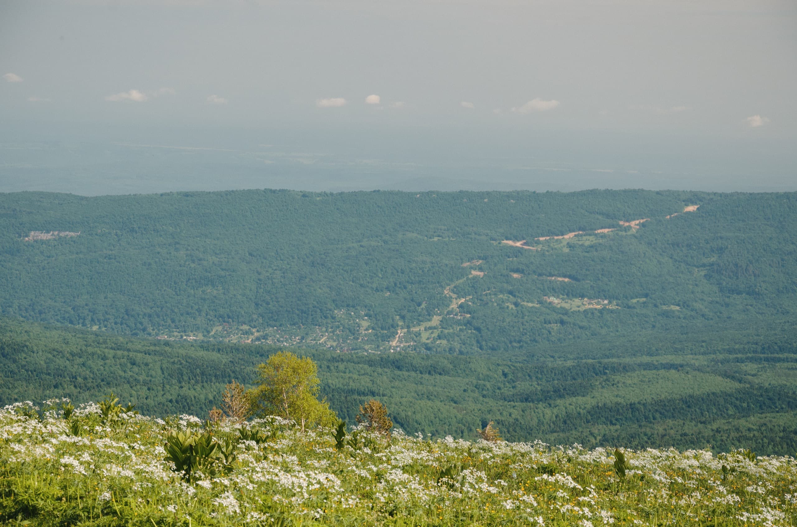 А на юго-востоке и востоке открываются не бескрайние, но очень, очень обширные луга. Это субальпика. В нескольких местах покатые складки зелёного ковра разрезают рыжие нитки дорог. Чуть дальше, видна Сухая балка. В её низовьях я дважды побывал летом 2013 года. О тех походах есть свои рассказы: первый и второй. А теперь вот стоял, любовался её верхним течением. Правда, оттуда, с Буквы, это была всего-лишь туманная, покрытая грязно-зелёным лесным ковром долина, за которой высится безымянный хребет. За тем хребтом течёт река Курджипс, прорезавшая горы Гуамским ущельем. К нему мы ещё вернёмся в конце рассказа.