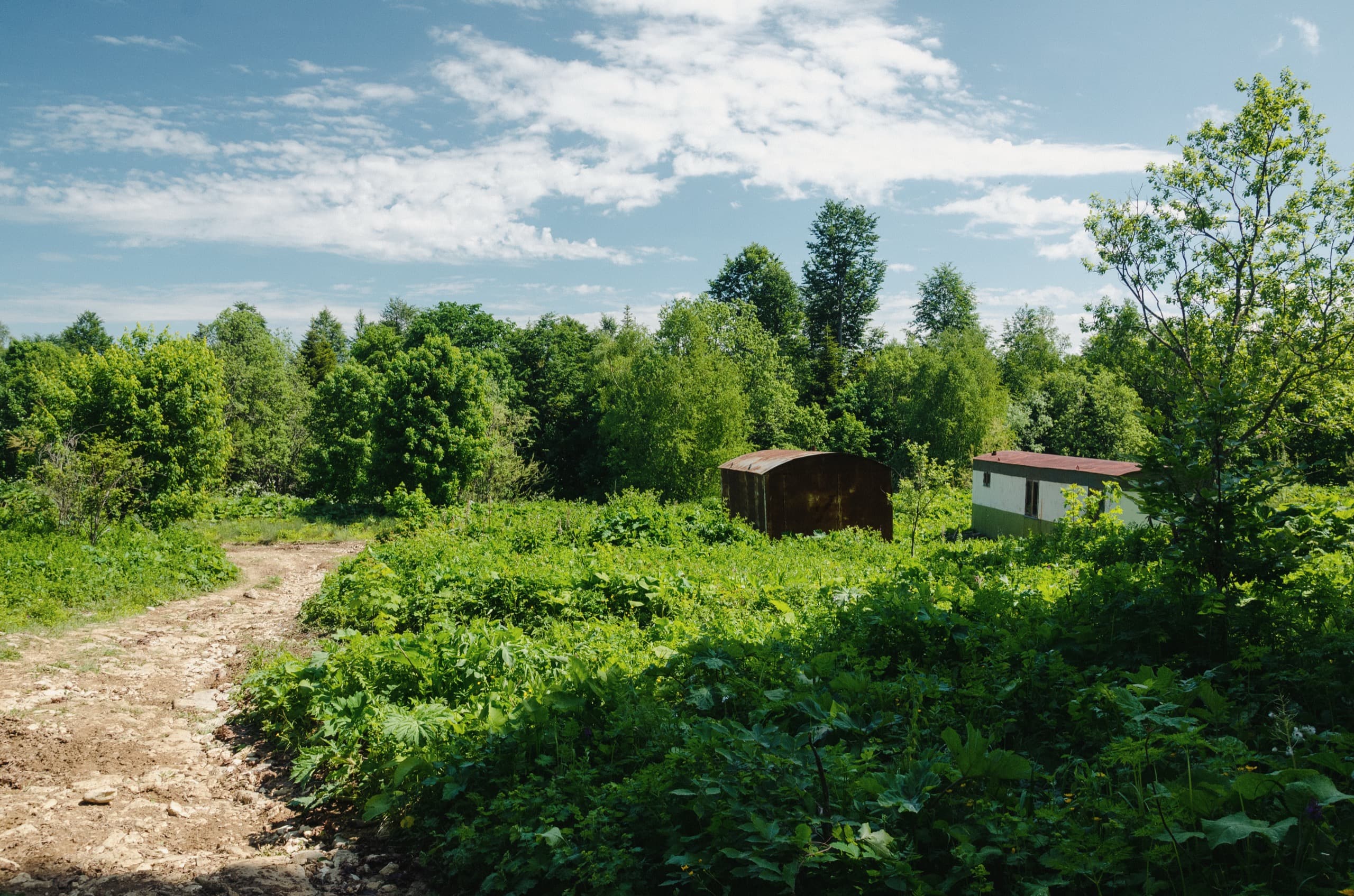 К обеду вышли к горе Зауда и Ивановым полянам. По расписанию подоспела непогода, мы стали искать укрытие. Обозначенный на карте кош сгорел, остались только грузовой контейнер и сарайчик. Путь к сарайчику преграждала высокая трава, а в контейнере хранились какие-то химикаты и пребывание в нём мы сочли небезопасным. Поэтому на дороге поставили тент от палатки и под ним спрятались от дождя.