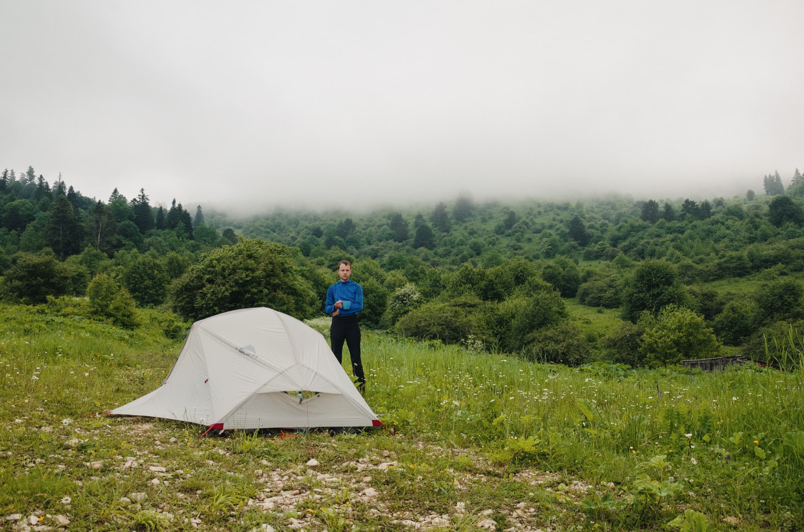 Прошло полчаса. Стук дождя утих, капли падали всё реже и реже. И вот, наконец, совсем замолчали. Я вышел наружу. Облака порвались, отступили, туман исчез, виды открылись. Самое время прогуляться. Взял фотоаппарат и пошёл наверх. Конечно, из-за мокрой травы идти было неприятно. Растительность высокая, местами до колена, вся мокрая... Но ей меня было не остановить. Пять минут и я на вершине.
