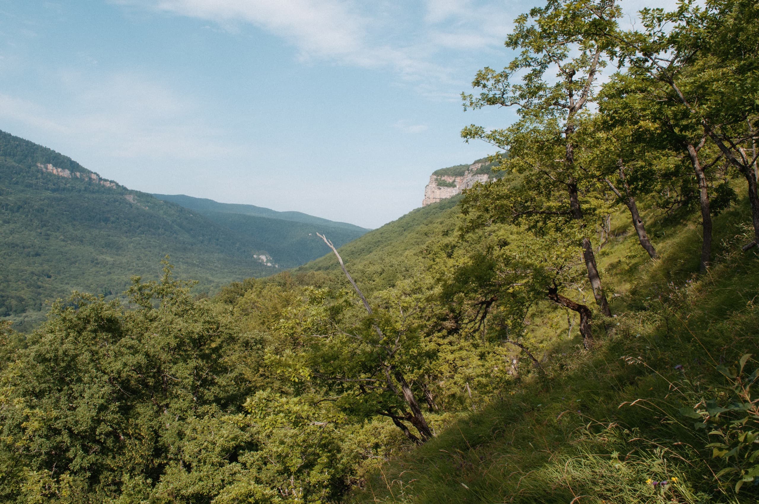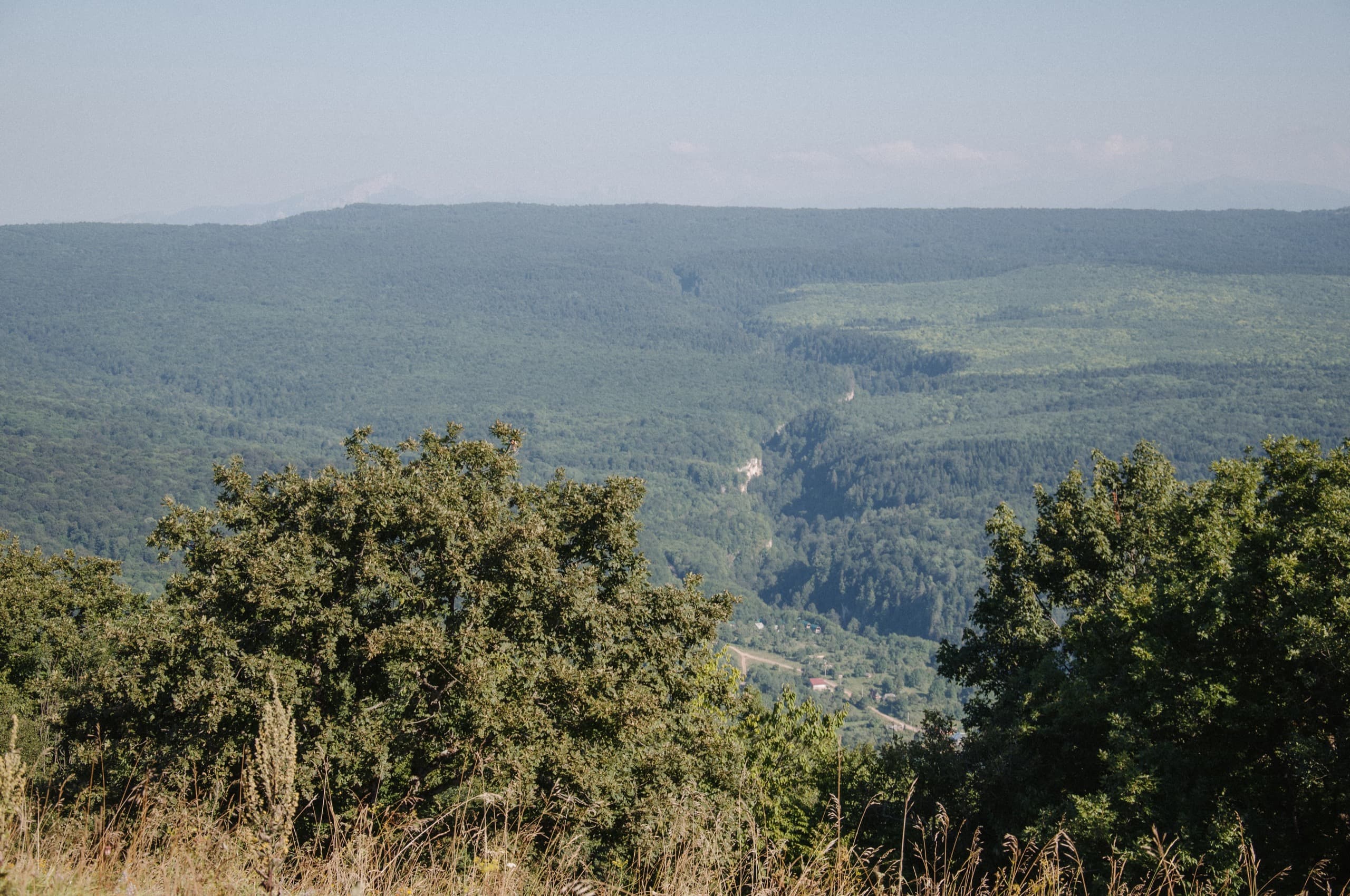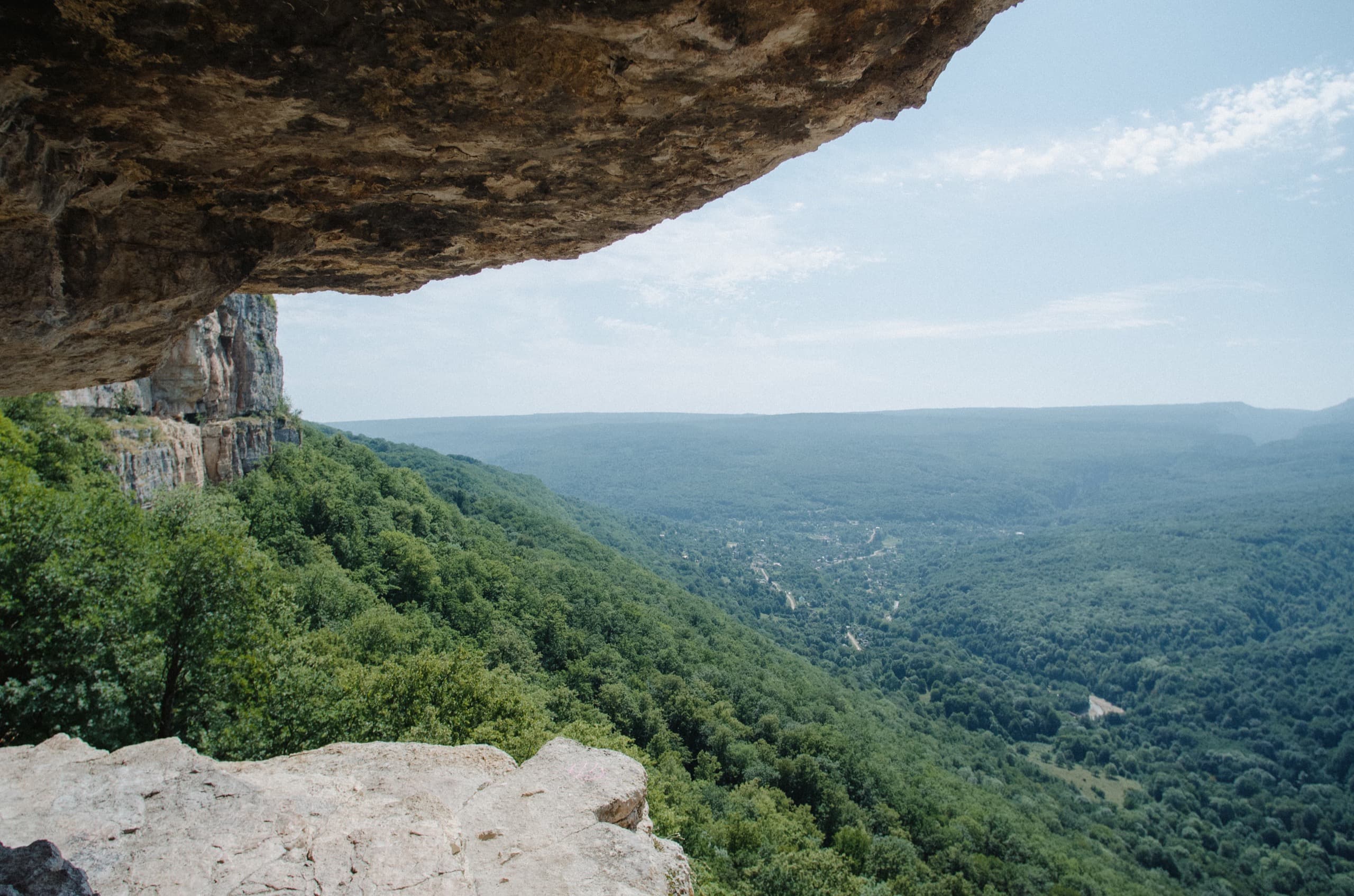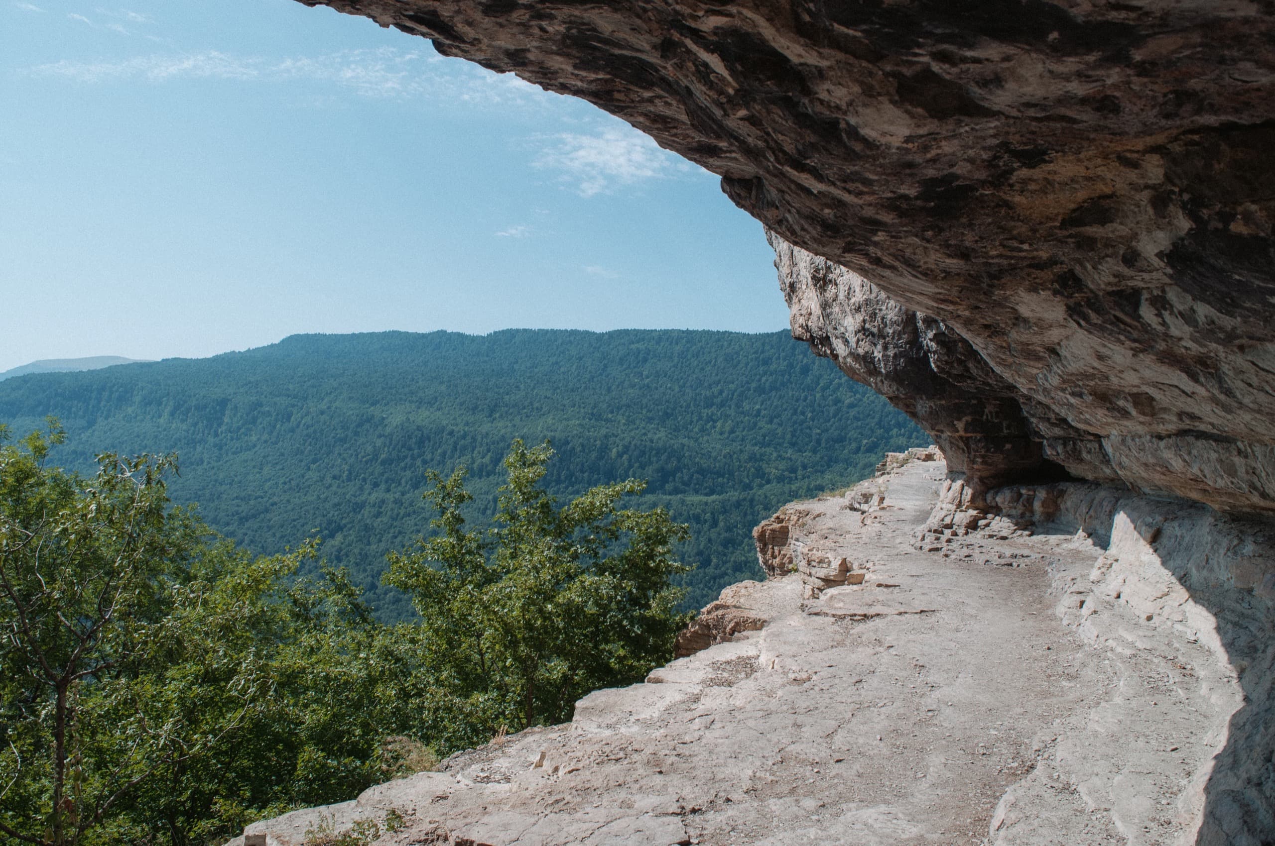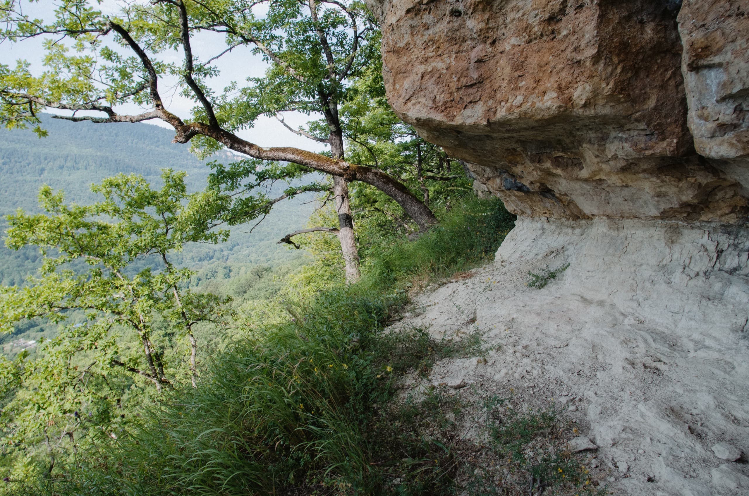 Тропа уткнулась в скальную стену, побежала вдоль неё, показала нам большой грот и внезапно оборвалась хорошей смотровой площадкой. Перед взором как на ладони предстало Курджипское ущелье.