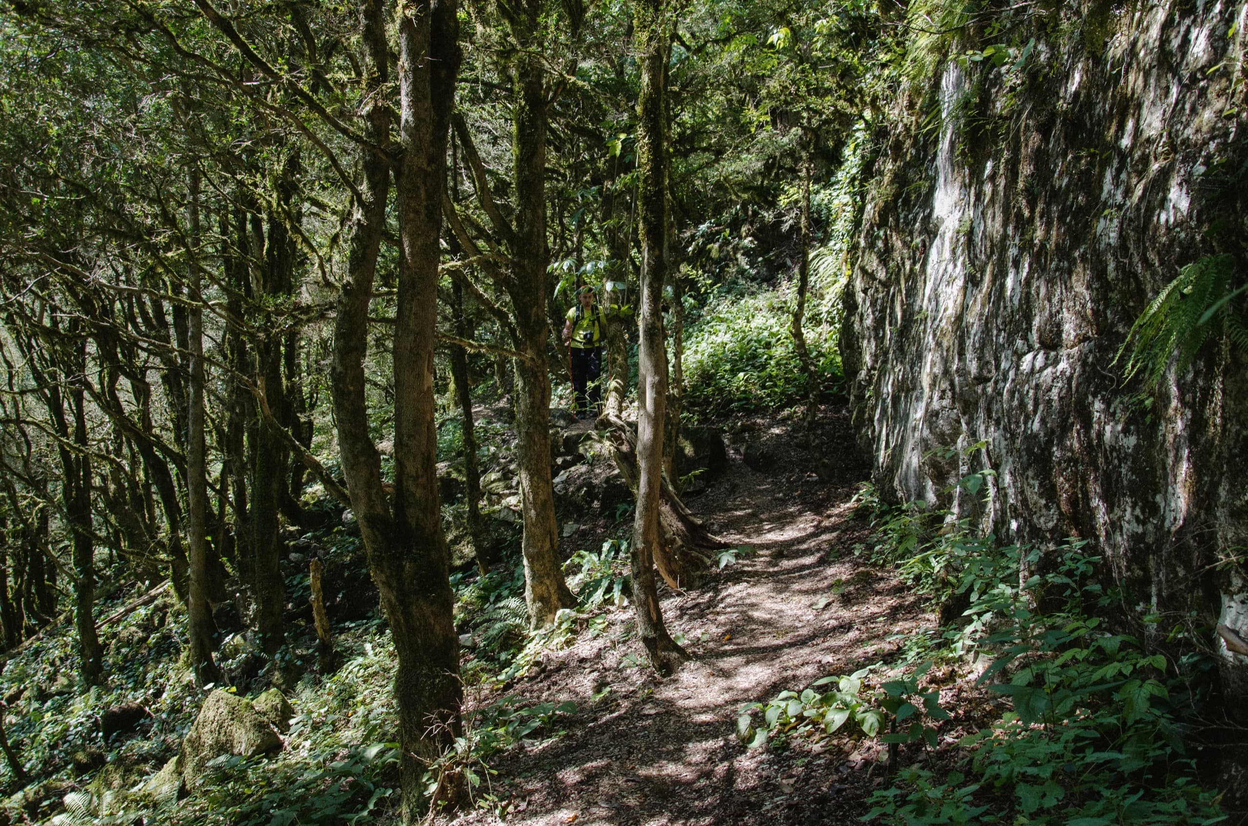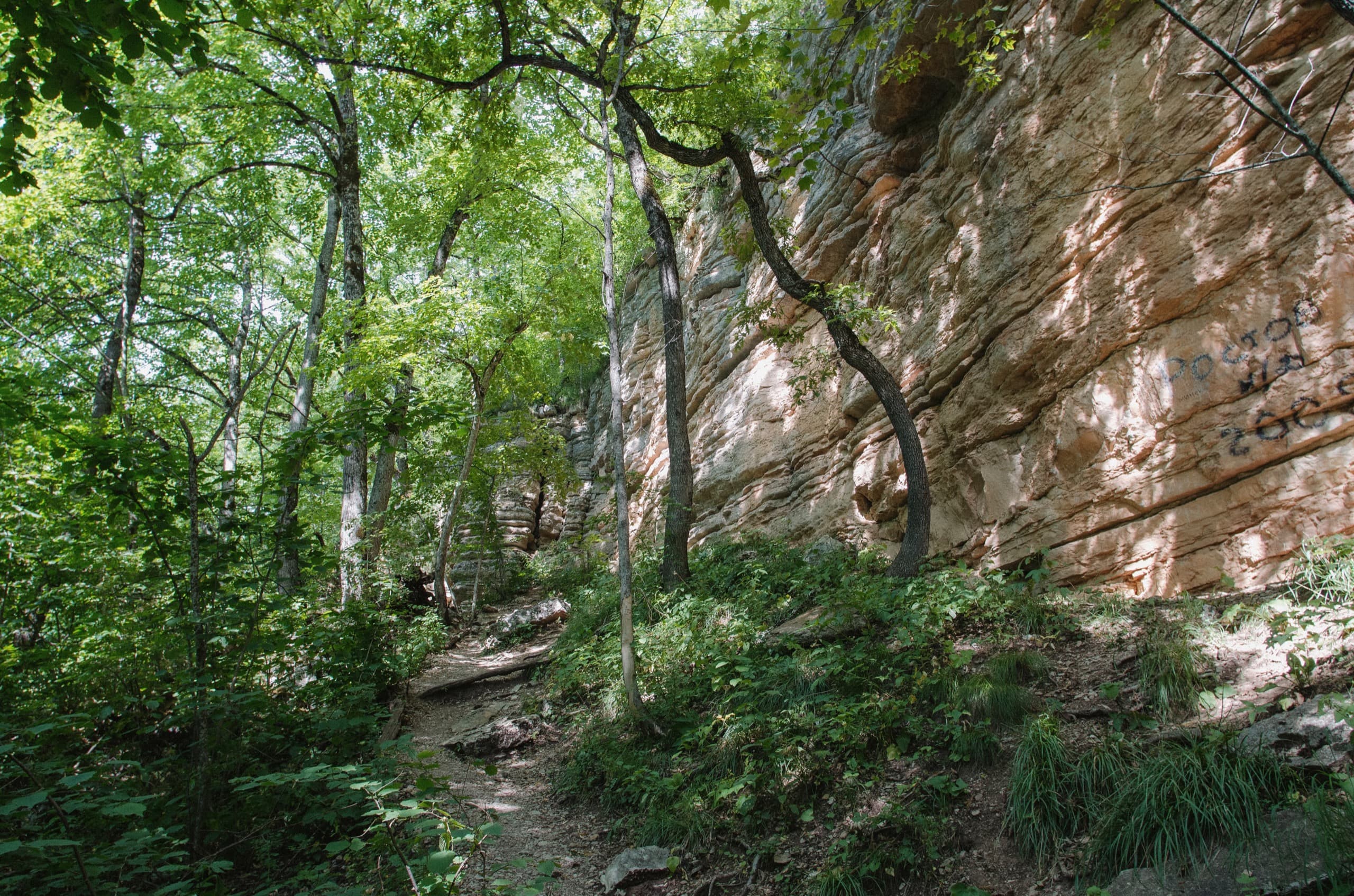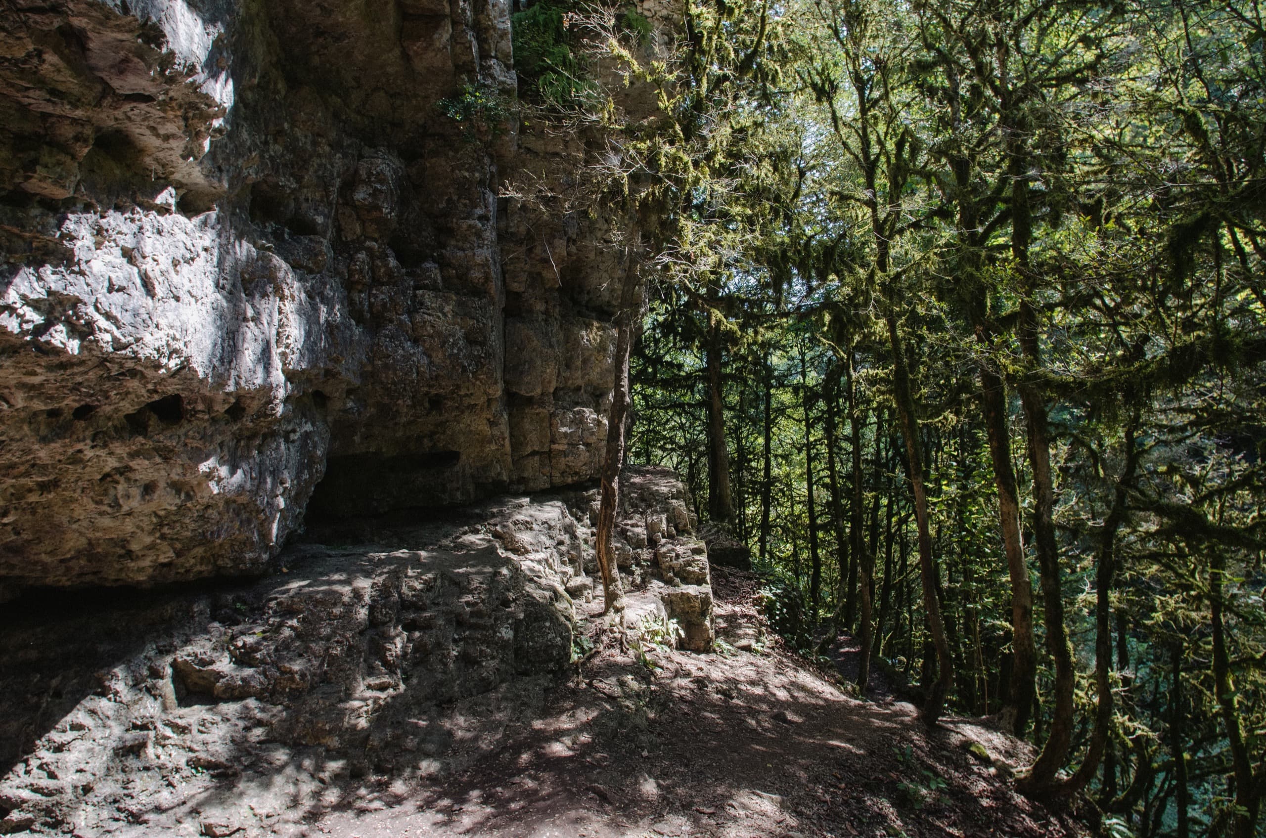 Вскоре после привала тропа привела к скальной стене и побежала вдоль неё, понемногу забирая вверх. Солнце сквозь прорехи в кронах, закидывало на стены, камни и тропинку яркие пятна, делая и без того приятный пейзаж ещё красивее.