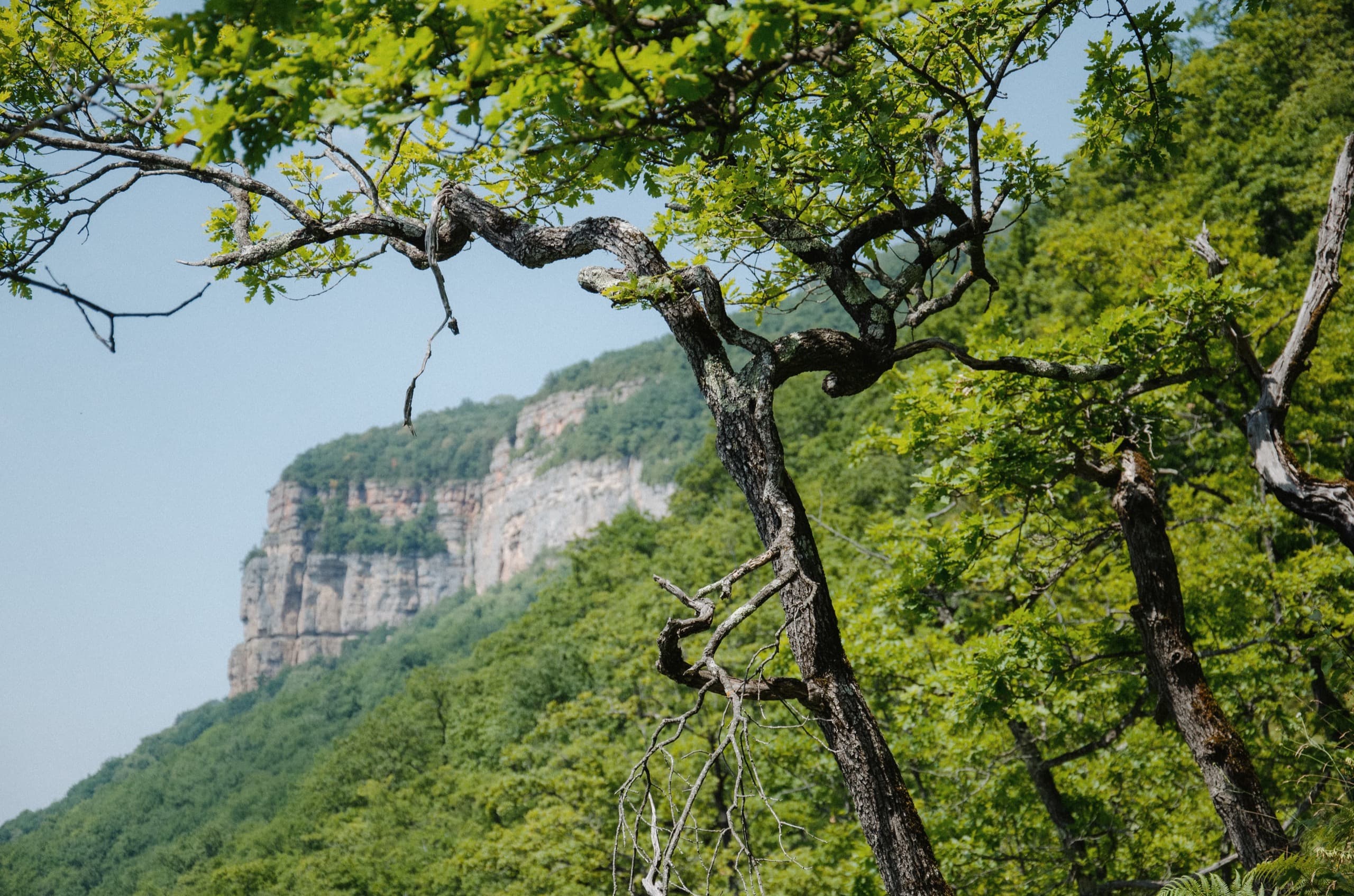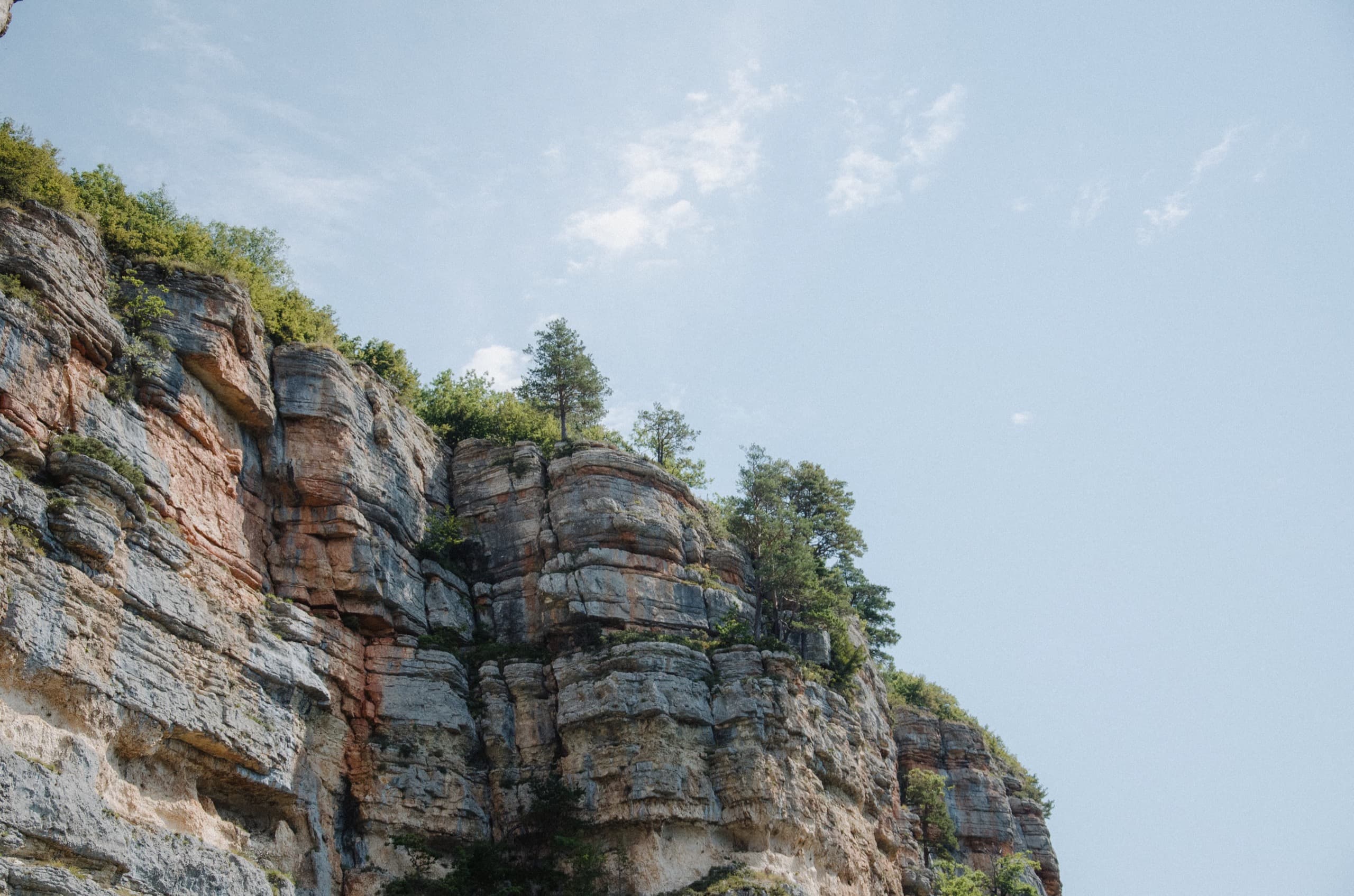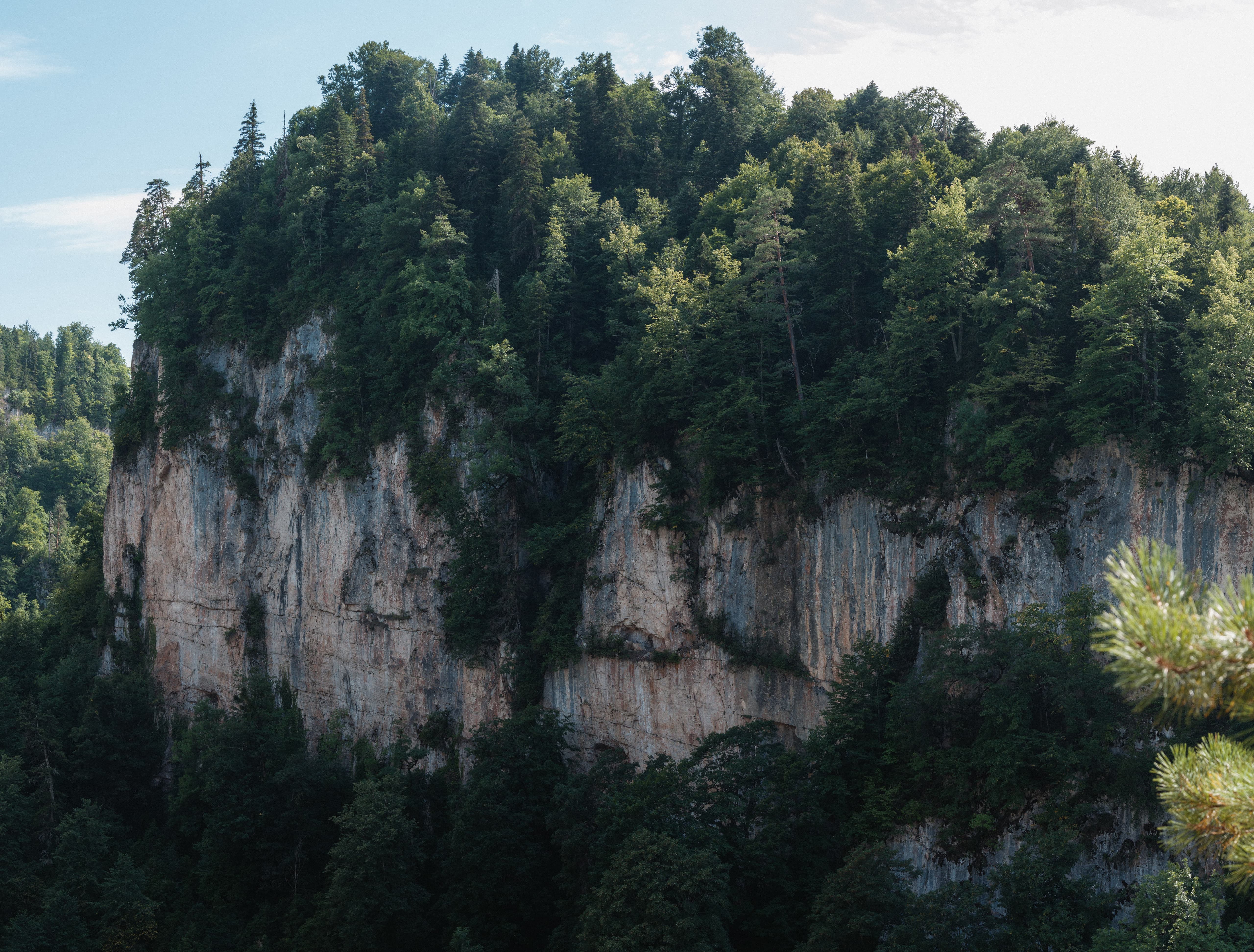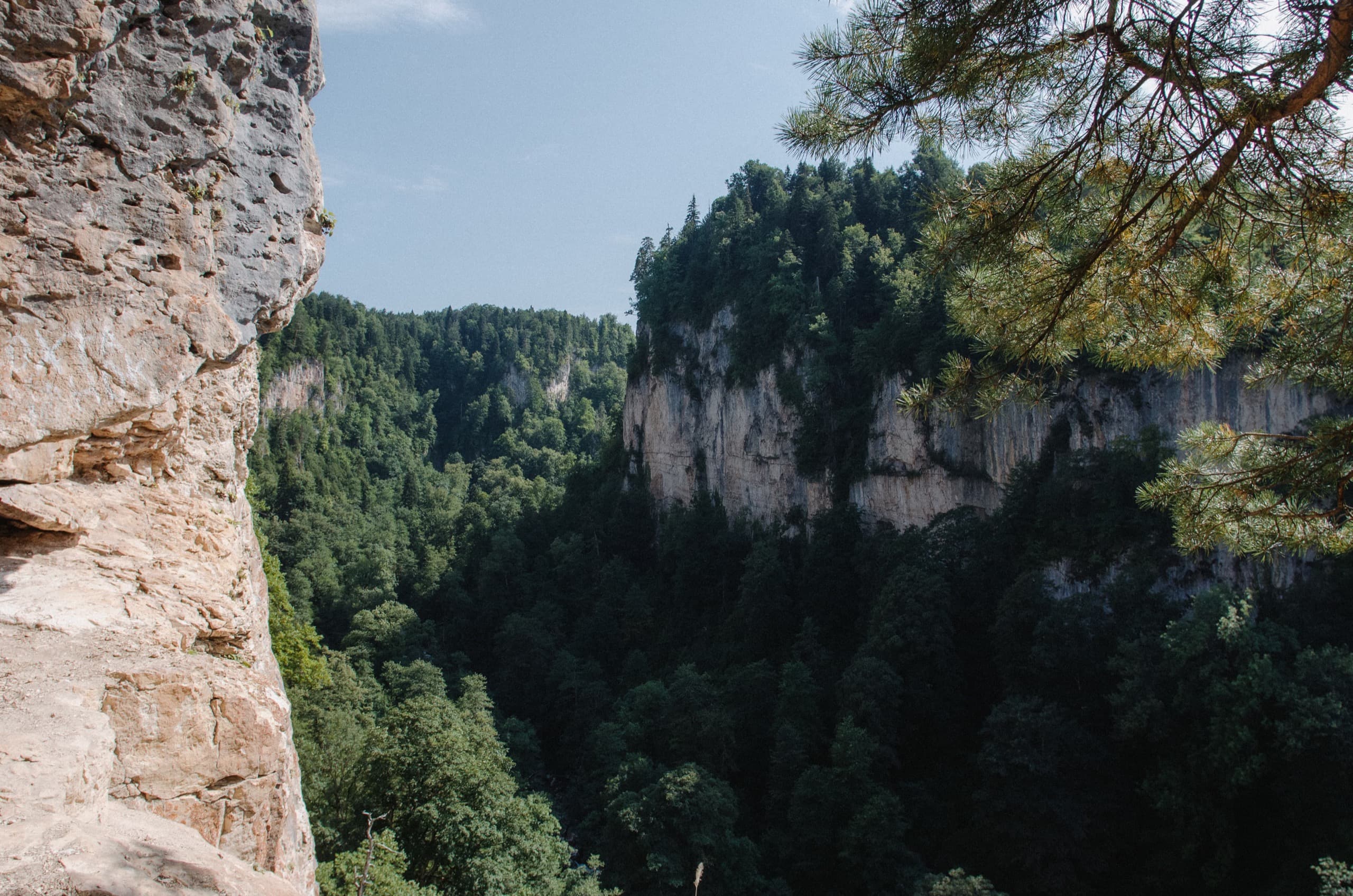 От полки отвесные скалы больше тянутся вверх, чем вниз — над головой свыше сотни метров вертикального обрыва, а вниз тридцать — не больше, после чего отвес упирается в макушки деревьев и катится вдаль к реке пологим, заросшим лесом склоном.