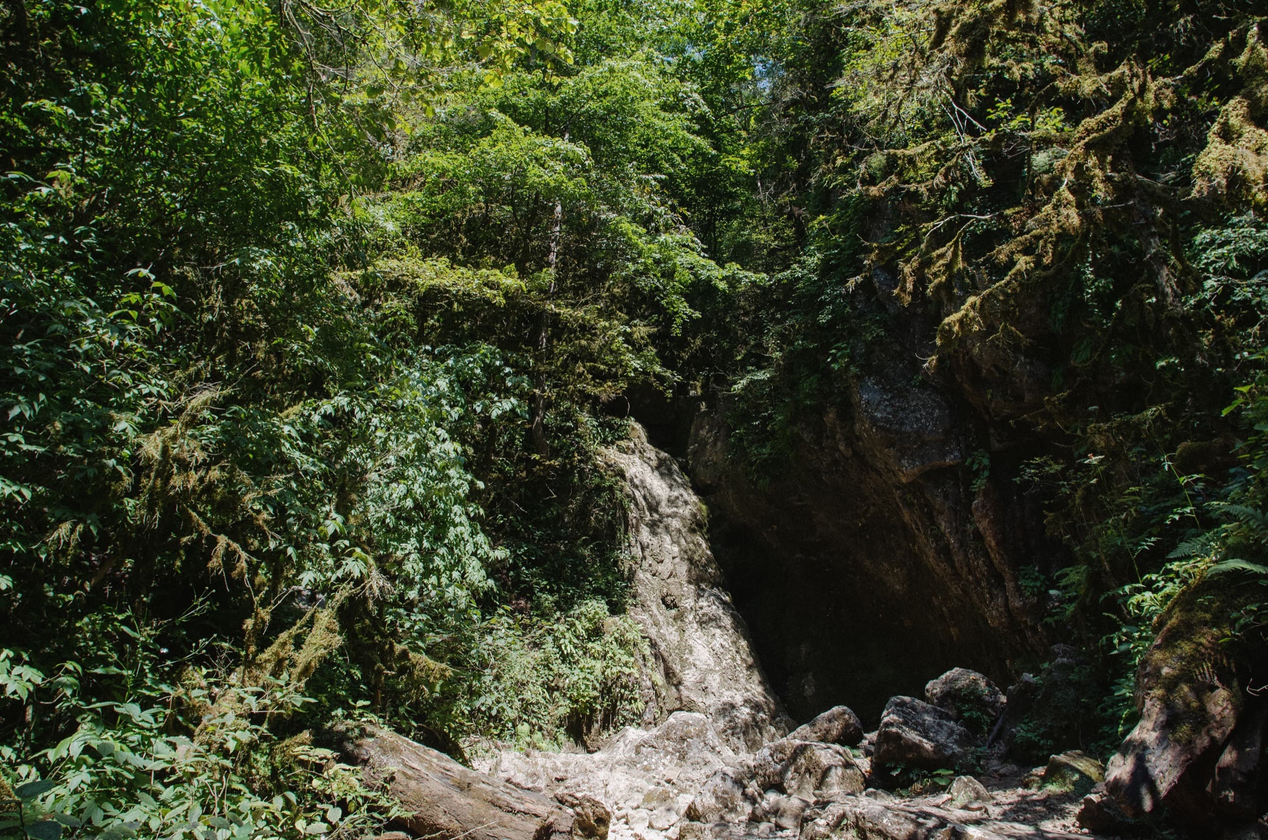 Из пещеры буйным потоком вырывался одноимённый водопад. Если он так полноводен в засушливую пору, каков же будет по весне? Логично, что в пещере заканчивалась водопроводная труба, которая всю дорогу вилась у ног. Предприимчивые жители организовали водопровод, который подаёт воду без насосов и электричества.