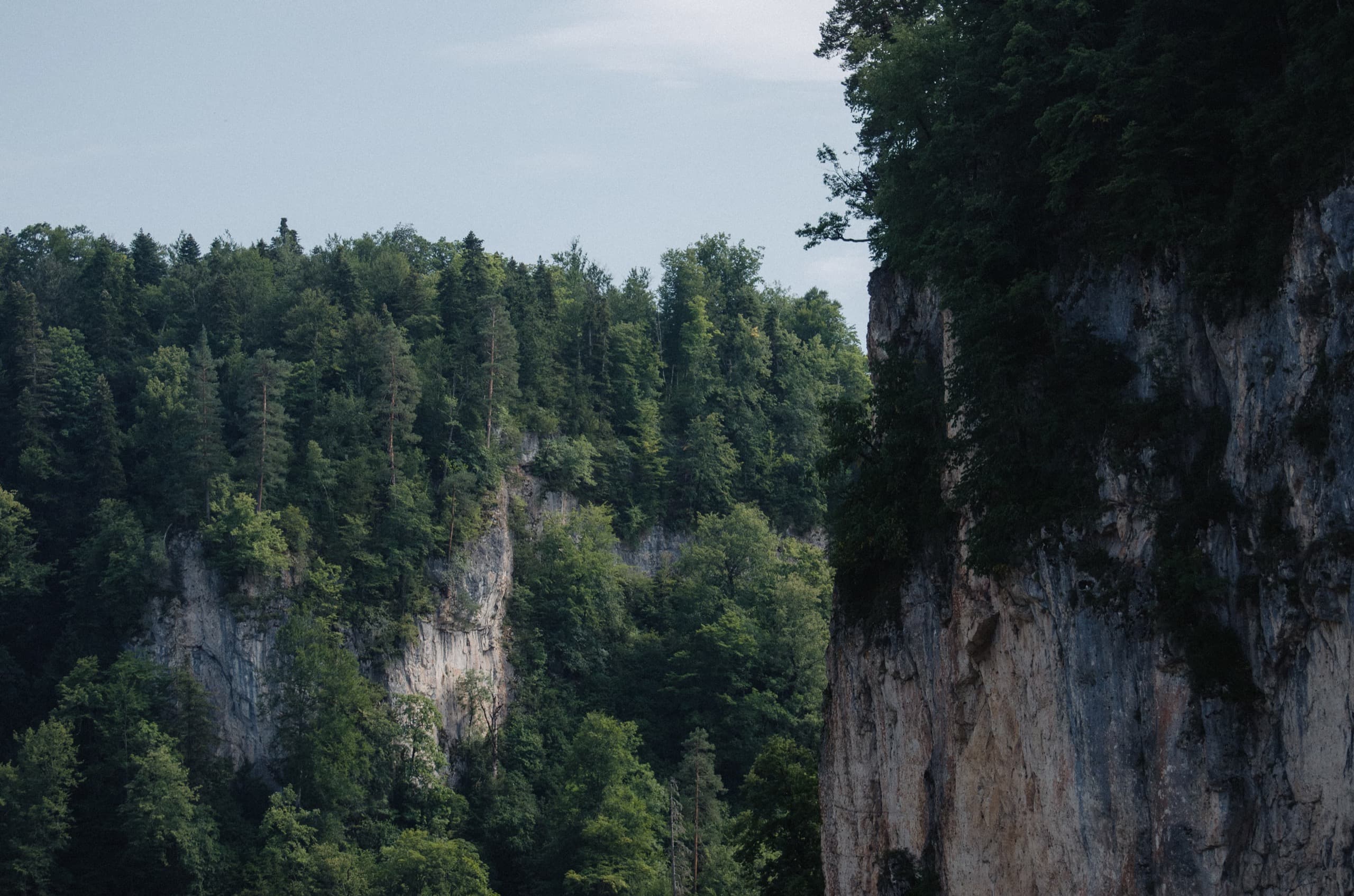 Высоченные отвесные стены сжимали реку. Мне показалось, что их высота точно приближается к сотне метров. Дно долины, как и её борта густо поросли лесом. Только самые крутые, отвесные участки оставались голыми, разрезая своей рыжиной зелёное полотно.