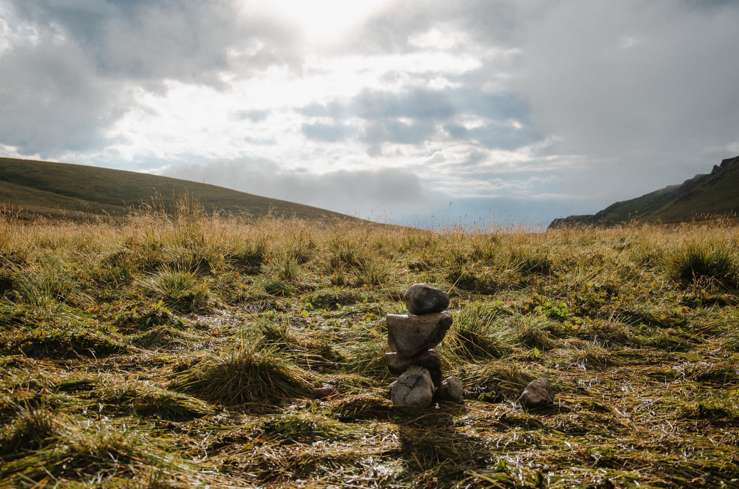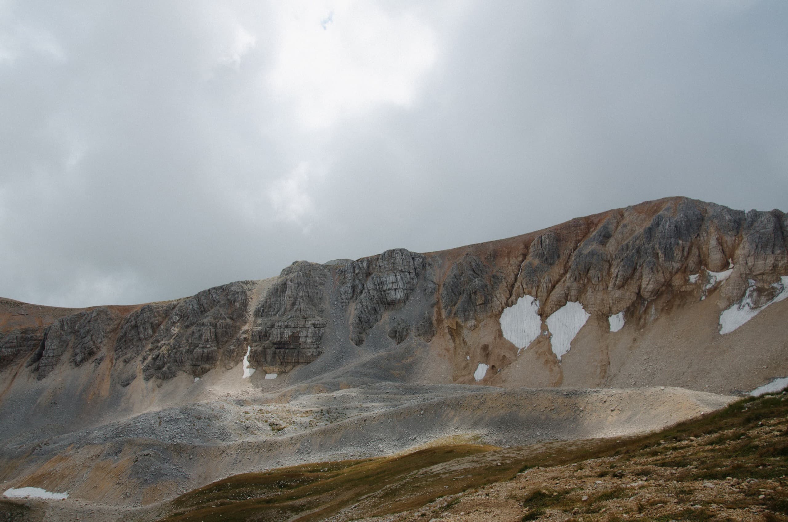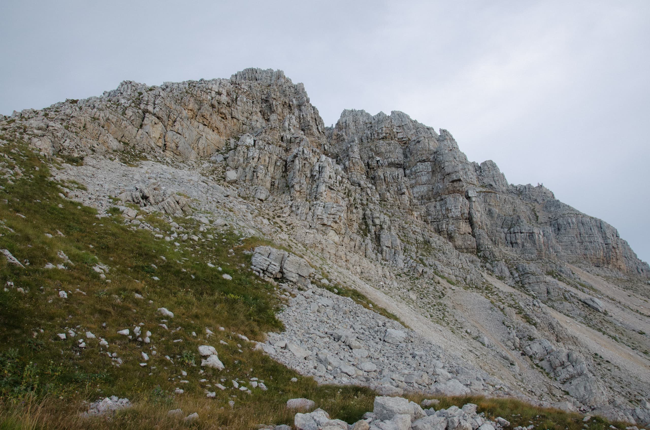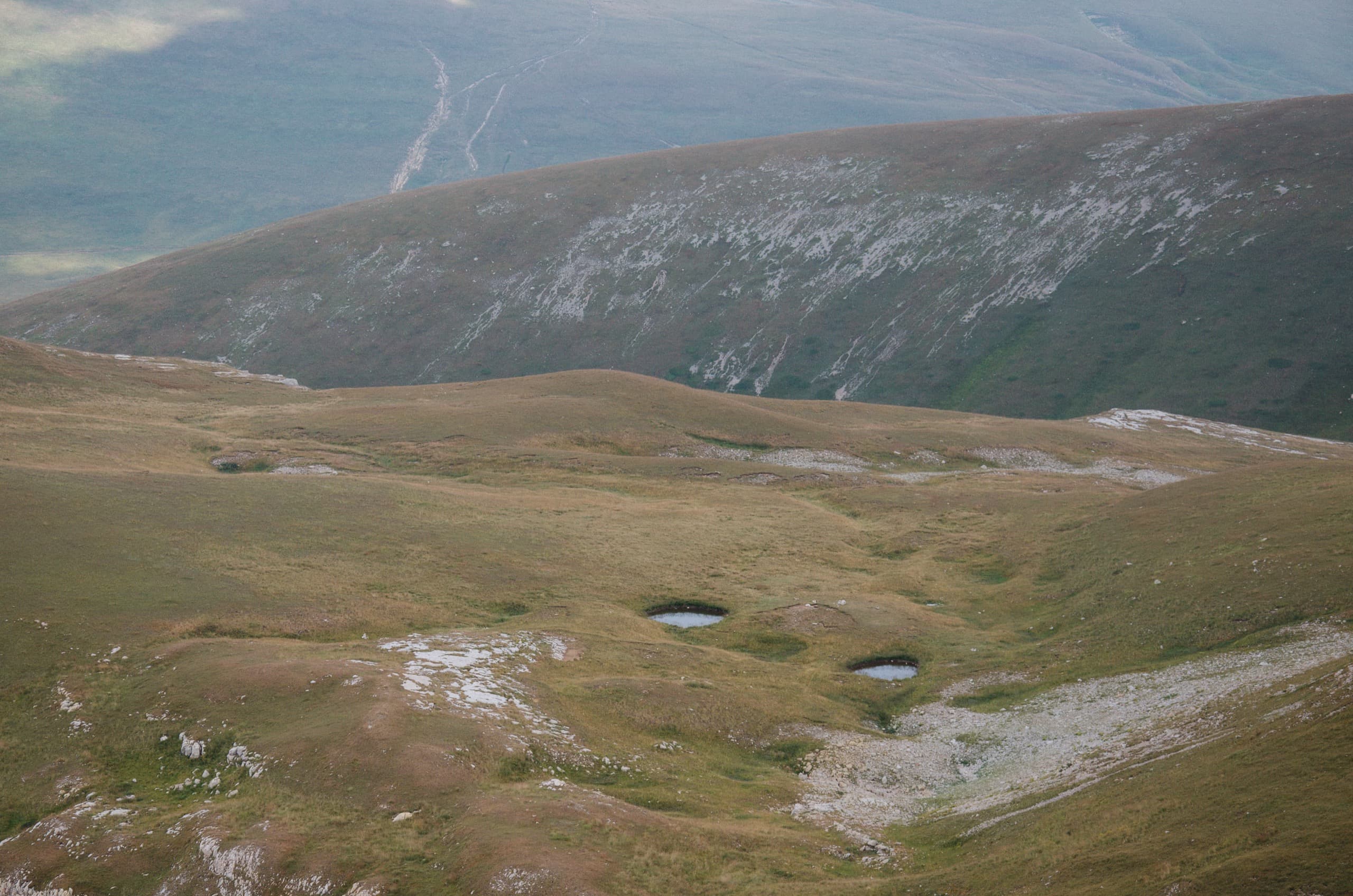 Окружающие нас склоны выглядели полем боя, на котором буро-зелёные травяные поля боролись с безжизненными каменными россыпями. На более пологих участках трава брала верх и вытесняла камень. Там, где покруче, порода брала верх, ощетиниваясь скальными зубами и обширными моренами.