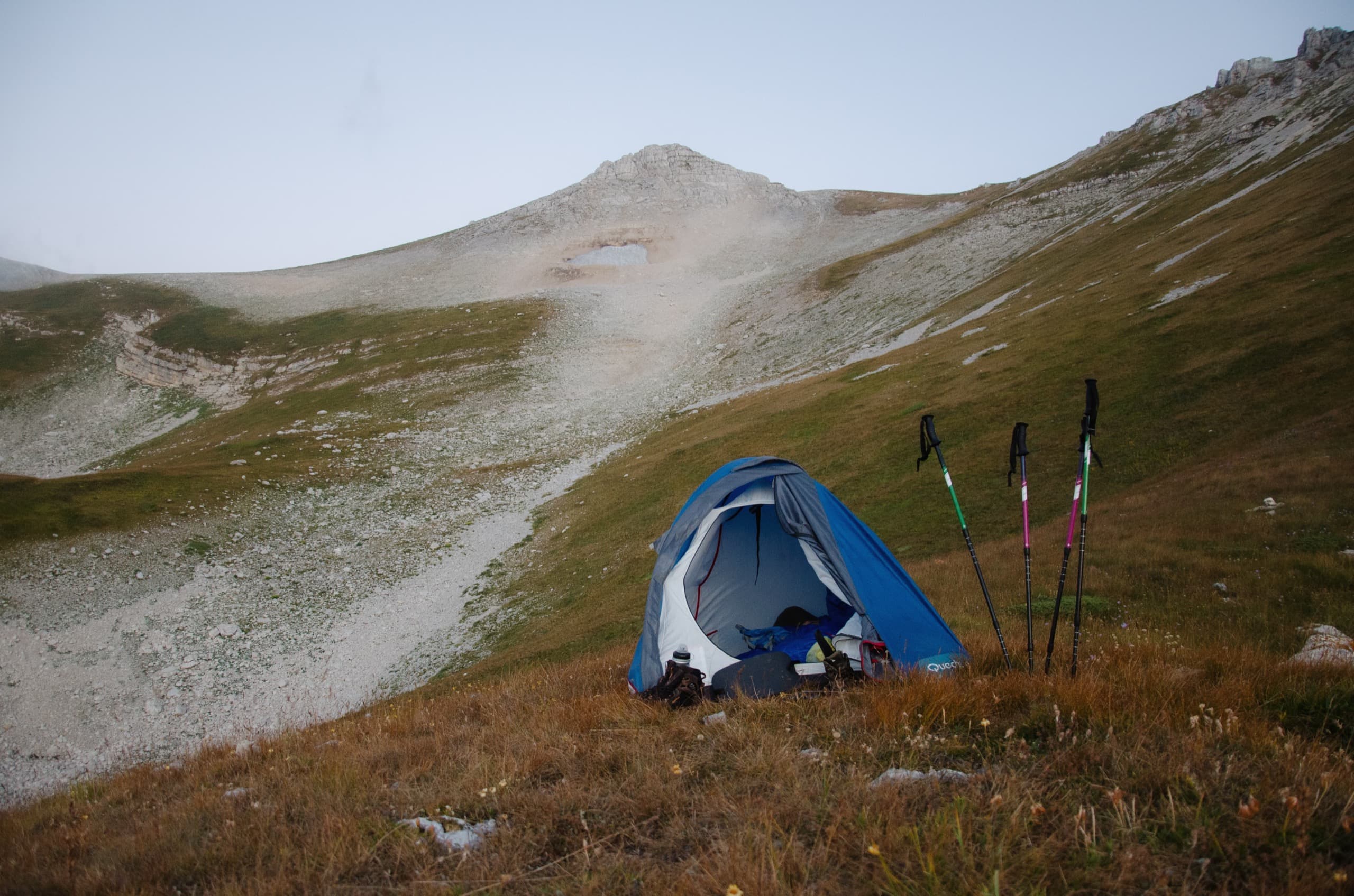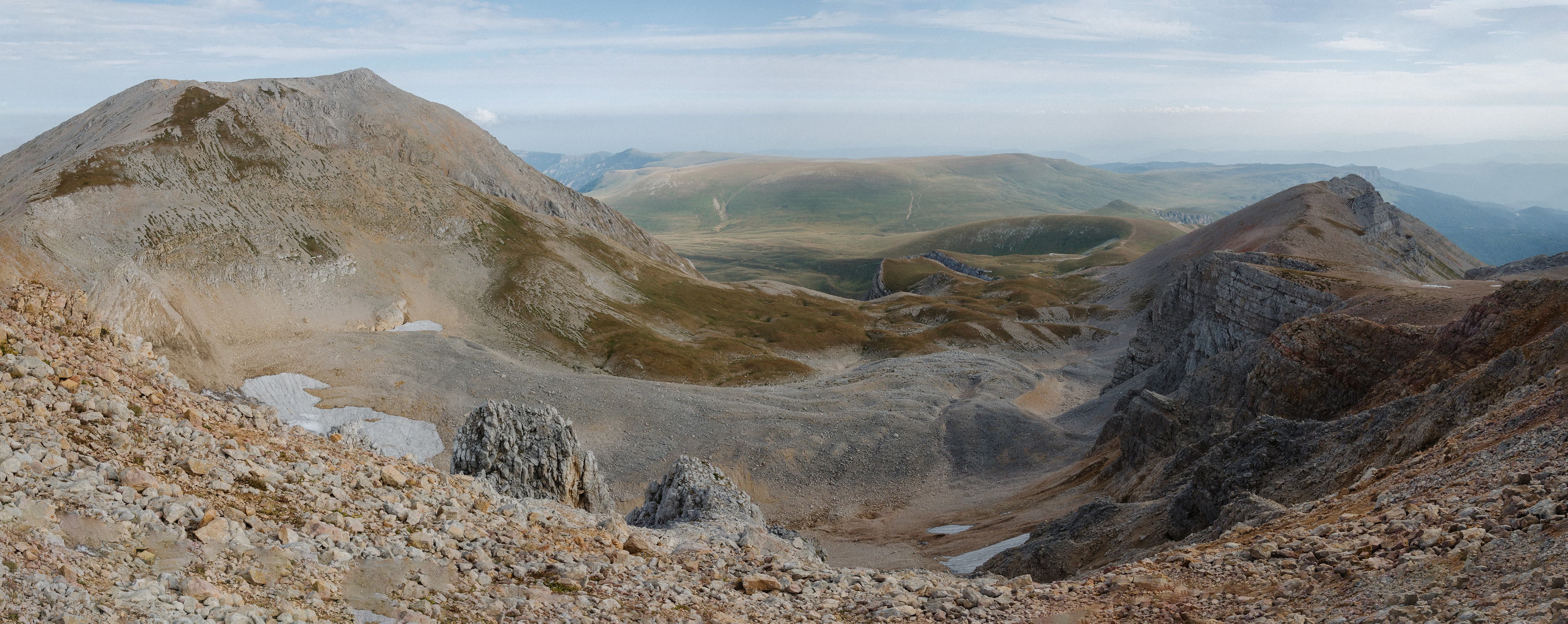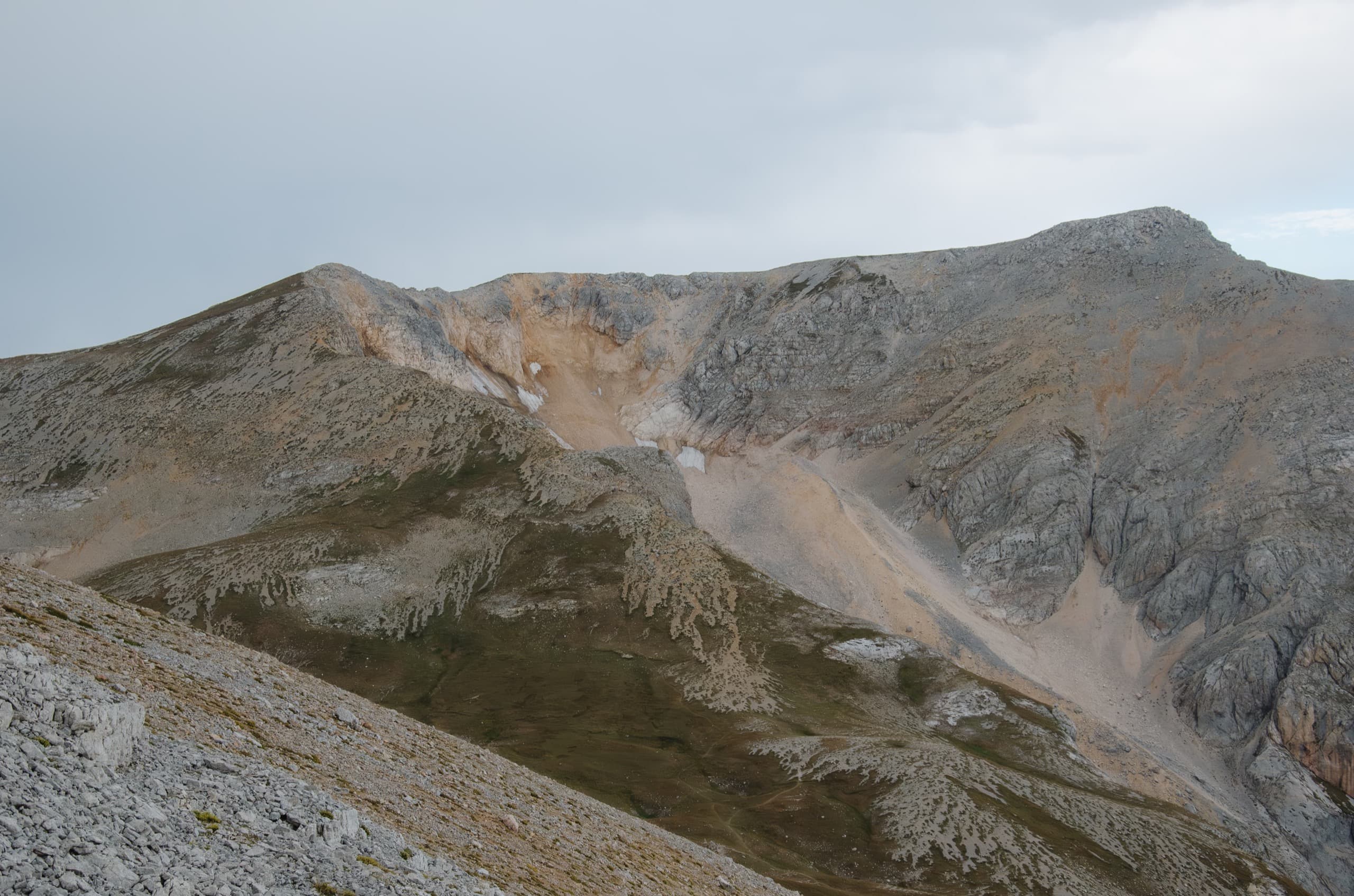 Окружающие нас склоны выглядели полем боя, на котором буро-зелёные травяные поля боролись с безжизненными каменными россыпями. На более пологих участках трава брала верх и вытесняла камень. Там, где покруче, порода брала верх, ощетиниваясь скальными зубами и обширными моренами.