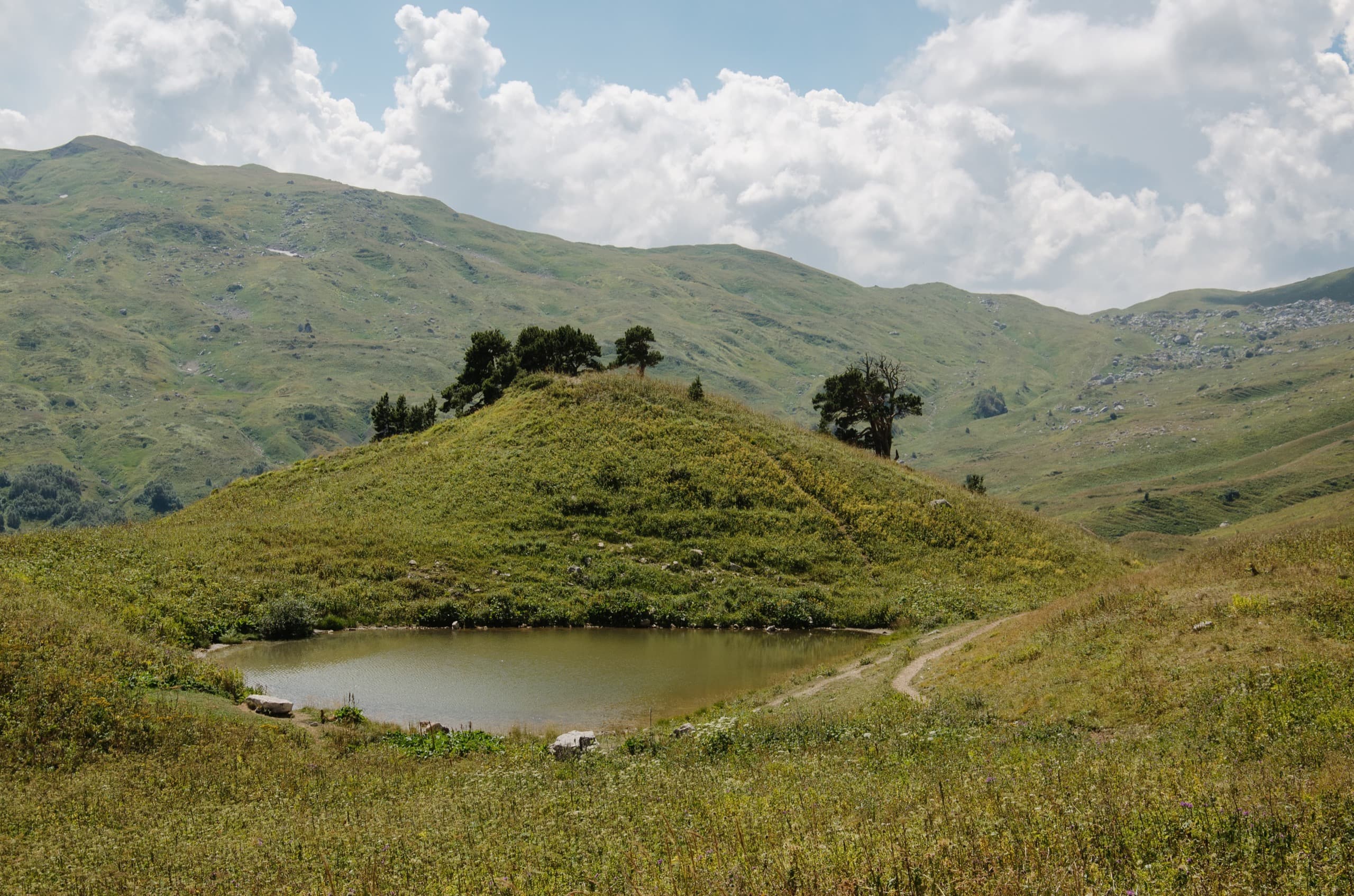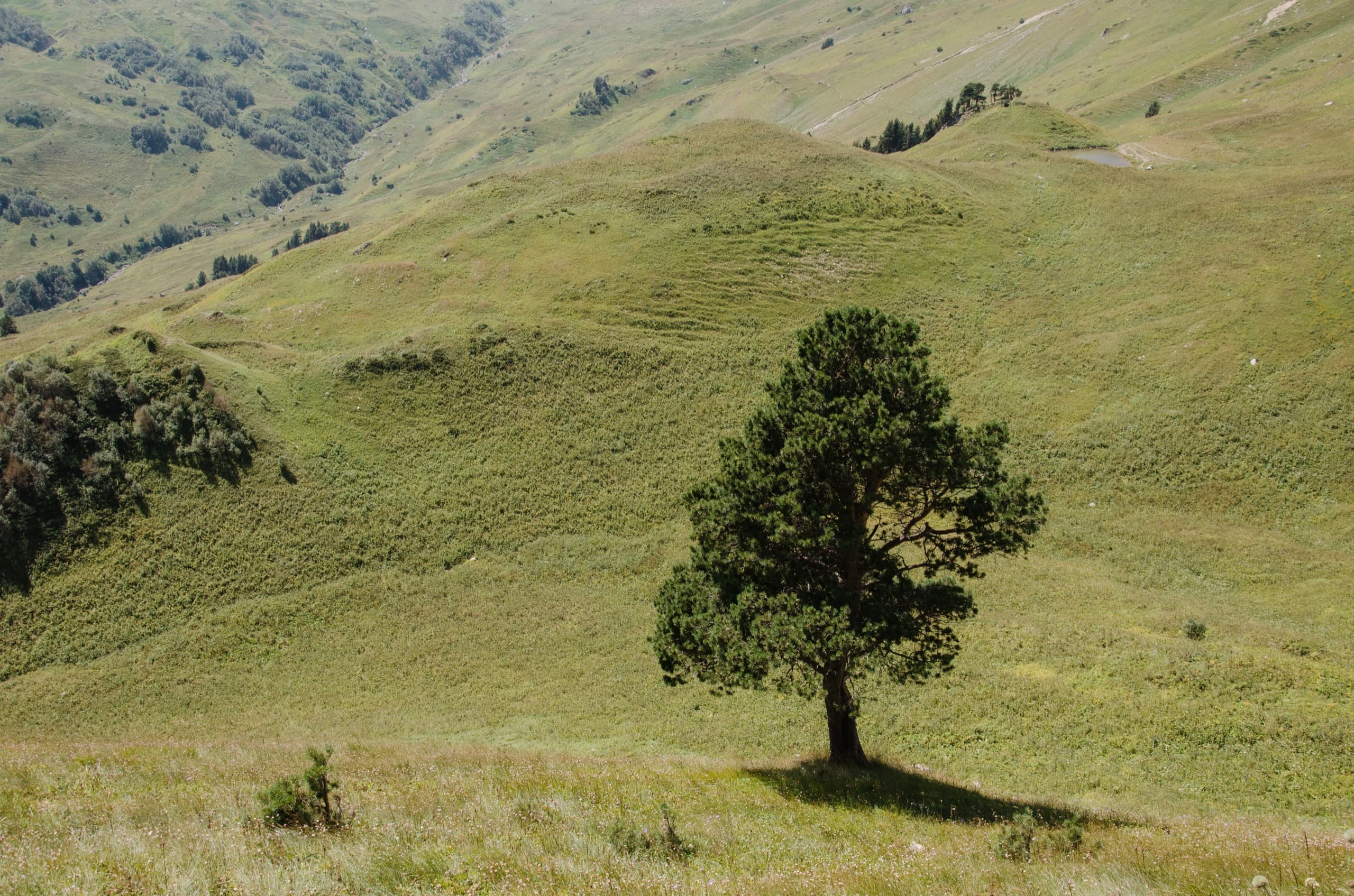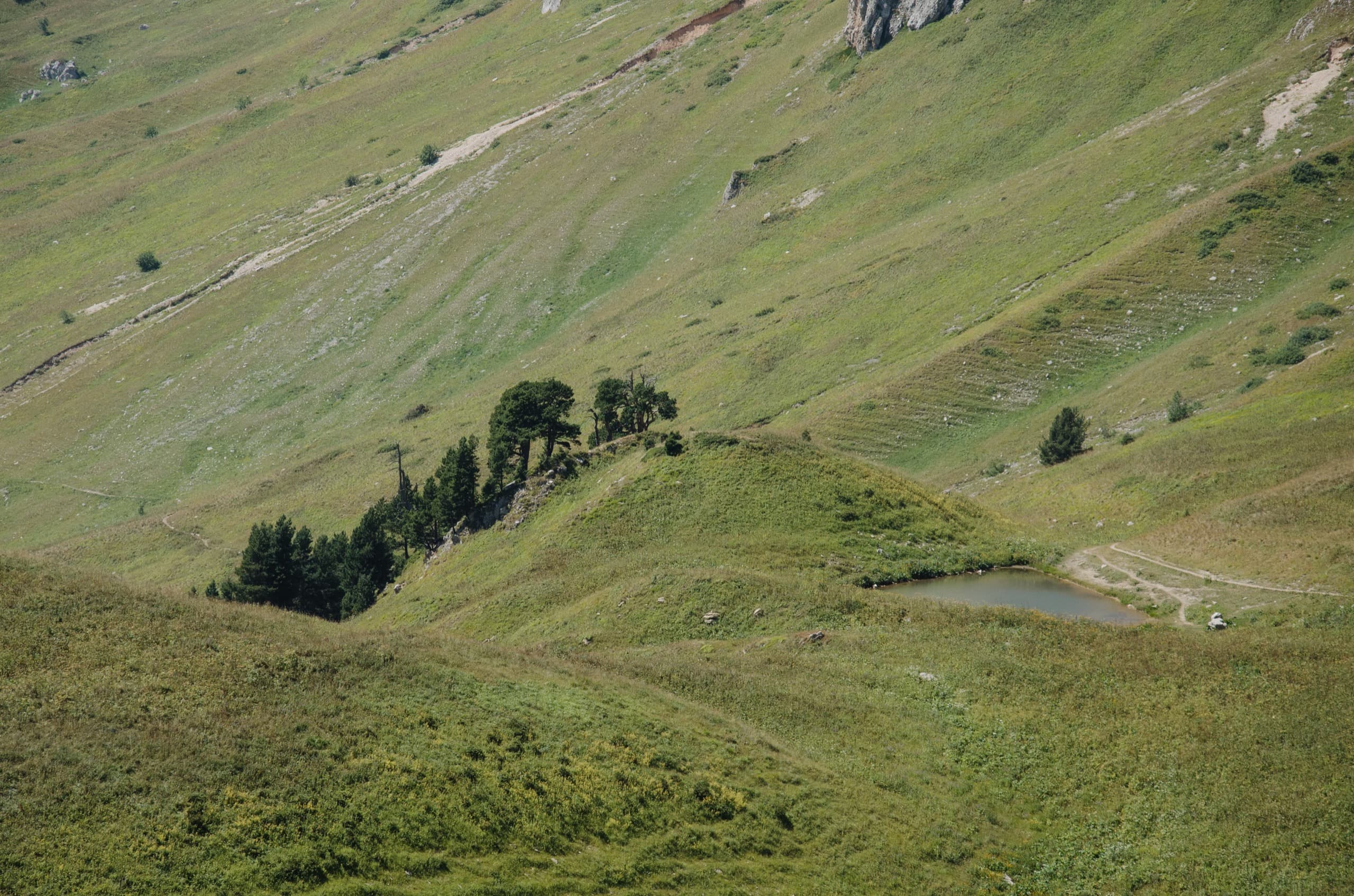За Змеиным расположился интересный холм, он невысок и его южный склон укрыт деревьями. Эта небольшая хвойная рощица очень живописно смотрится на фоне обширных субальпийских лугов.