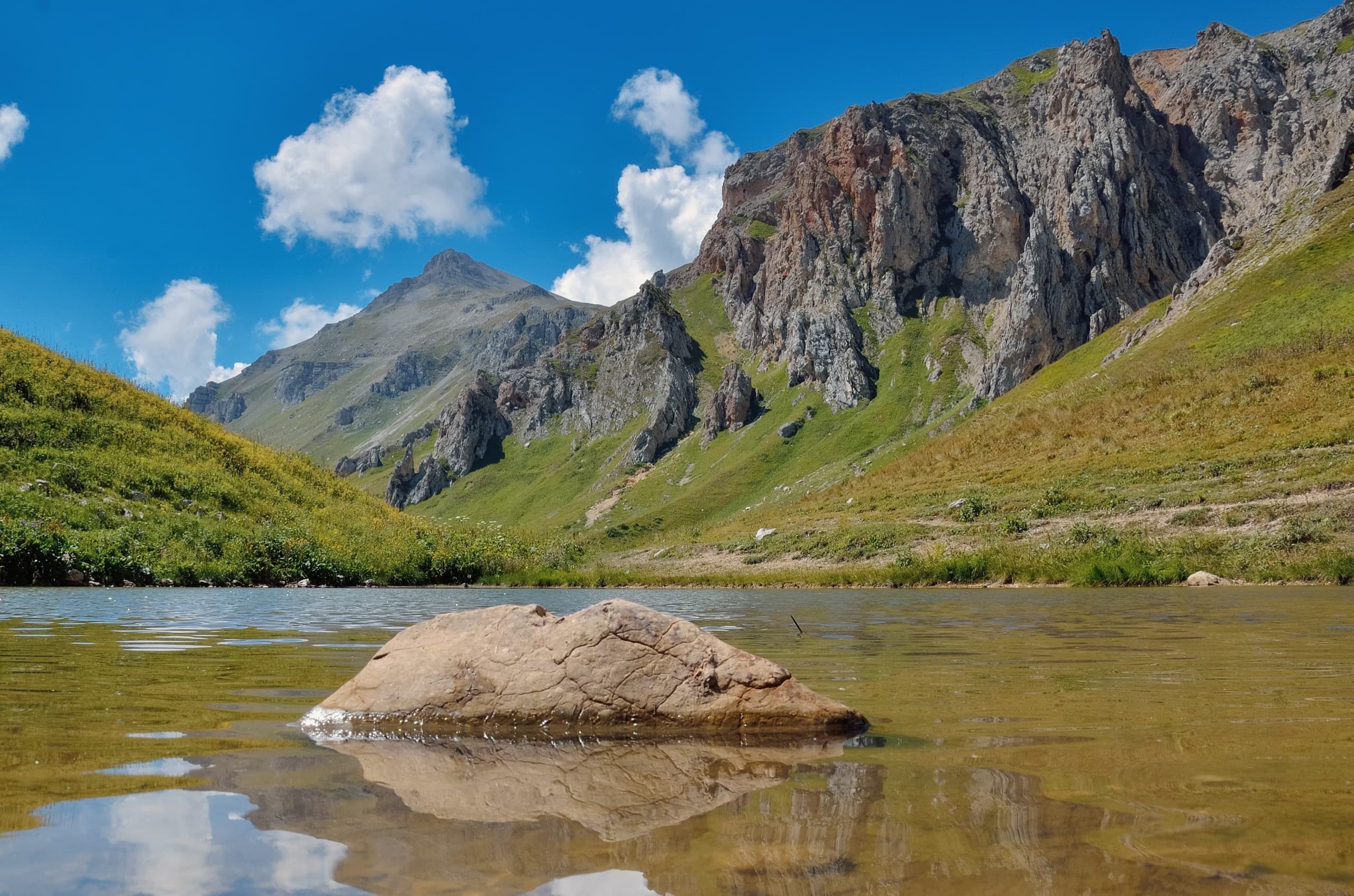 Берега озера были усыпаны камнями, местами среди тех безжизненных россыпей можно было заметить хрупкие цветы. А у самого уреза воды нашли снежник — знаменательно событие, никогда раньше в августе я снег не трогал.