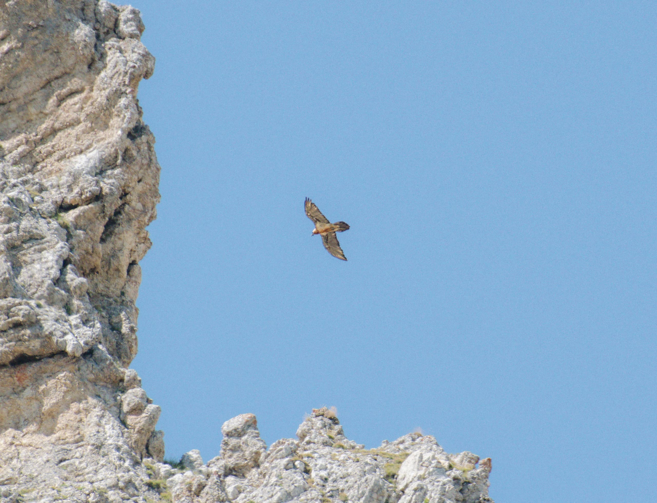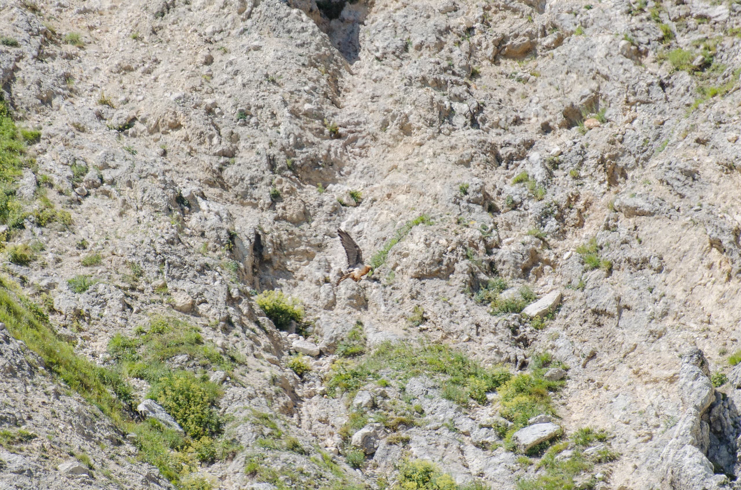 На привале у озера наблюдал сцену охоты бородача. Он появился из-за Бляма и в течение пяти минут нарезал круги у обрывов. То прижимался к склонам, едва не цепляя крыльями камни, то приближался к нам. Потом в один момент кинулся на каменистую осыпь, кого-то схватил, прыгнул на ближайший камень и принялся трапезничать.