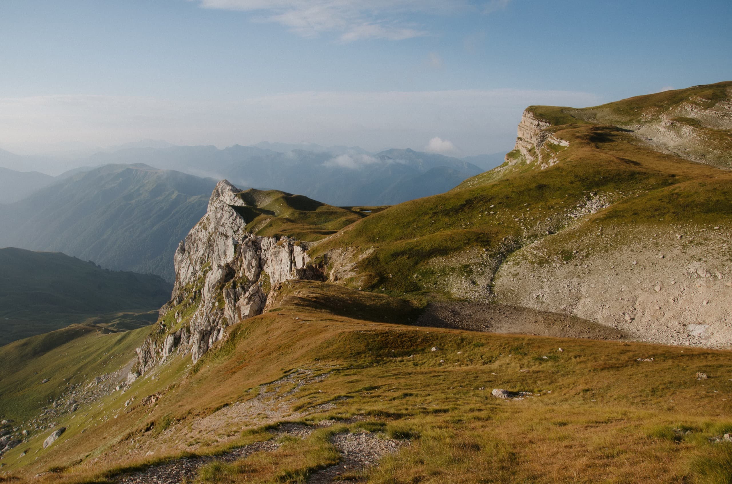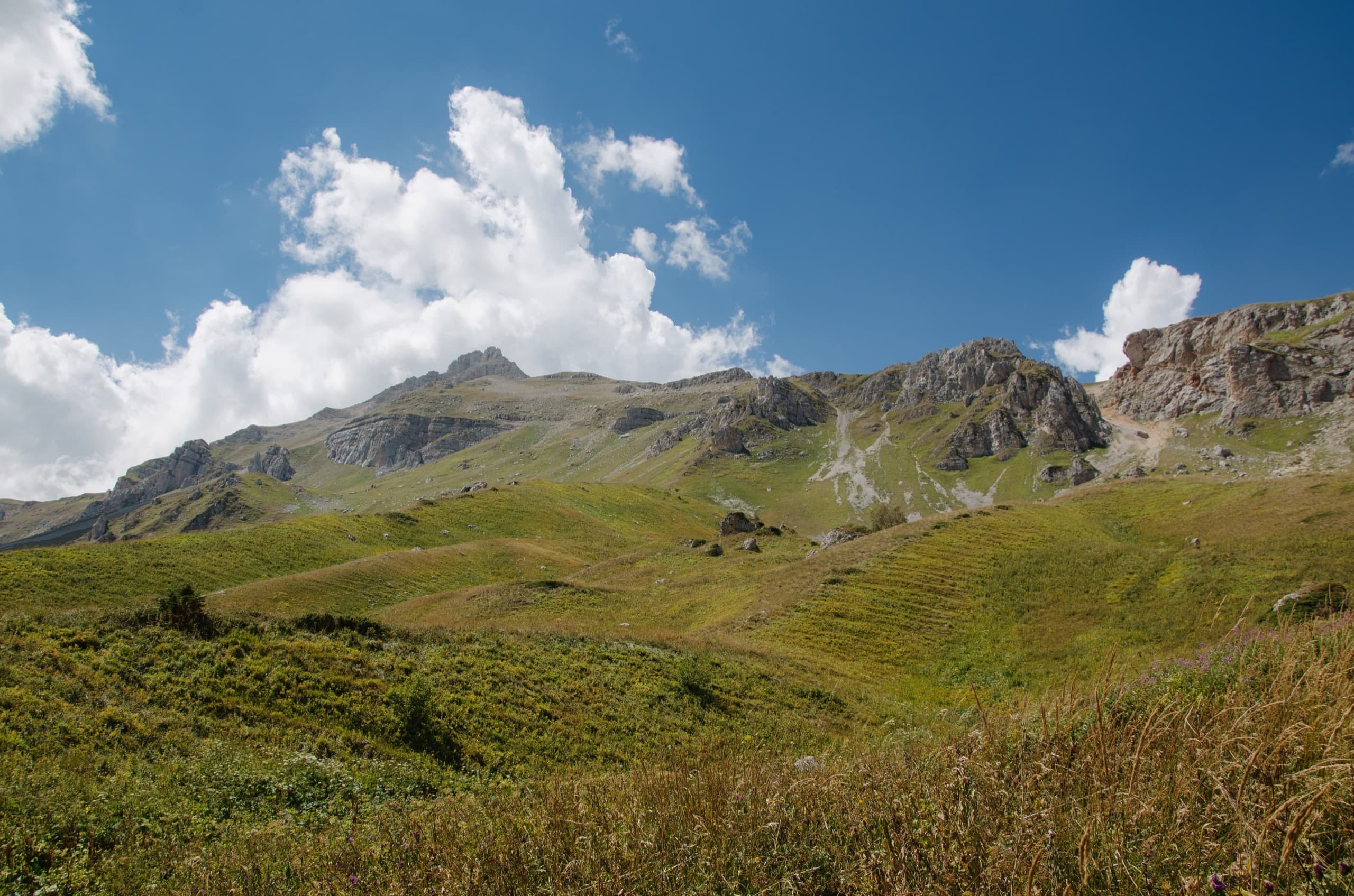 Вскоре за развилкой тропа выбралась из леса на залитые солнцем луга. Могучие борщевики, сквозь которые пробирались в июне, к августу иссохли, завалились набок и уже не докучали. Изначально собирался выйти на перевал Оштен и уже от него повернуть к Инструкторской щели, но некая, не обозначенная на карте, тропинка отвлекла внимание и срезала нам полкилометра, выведя прямо к воротам, образованным двумя невысокими скалами.