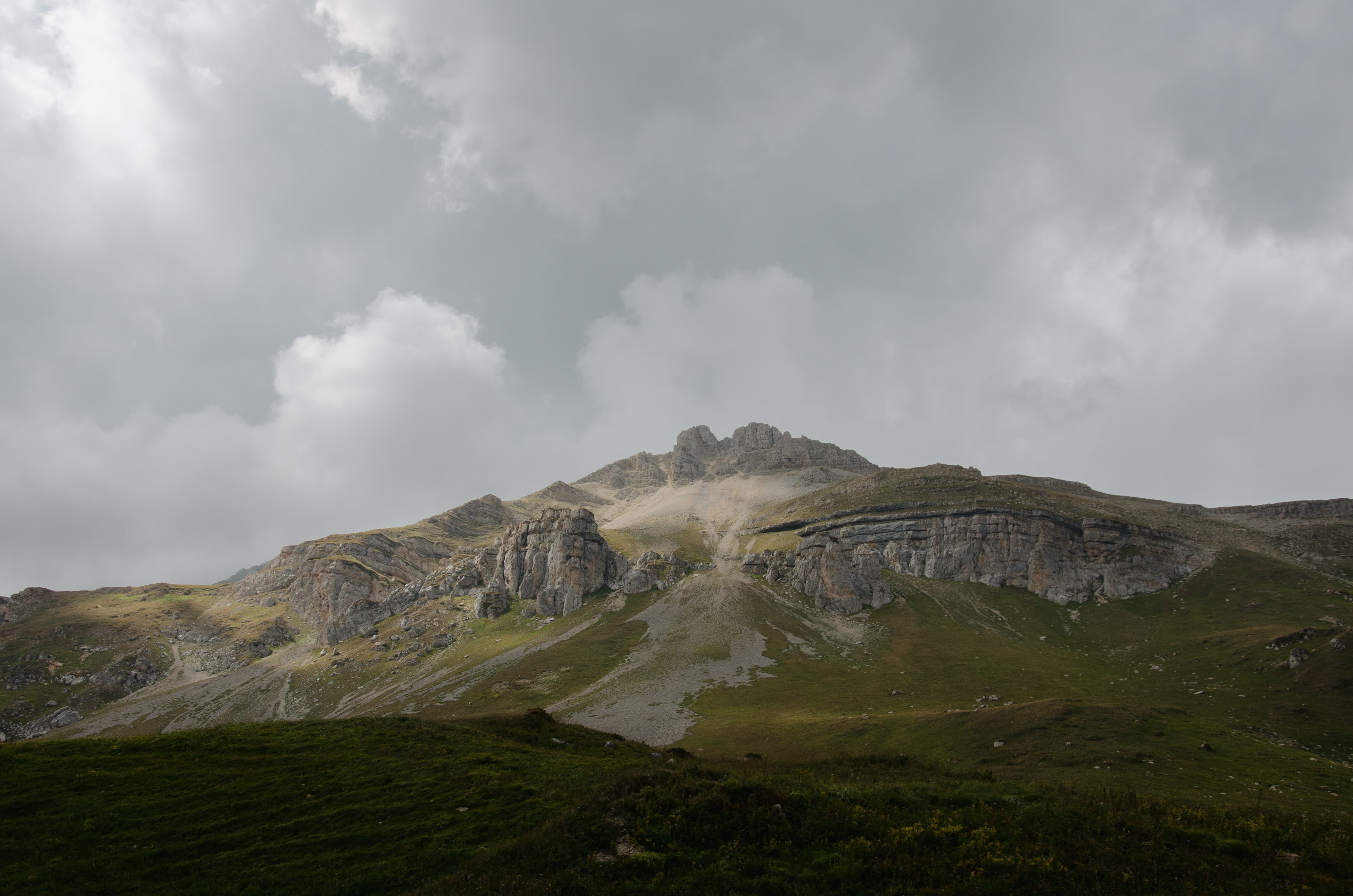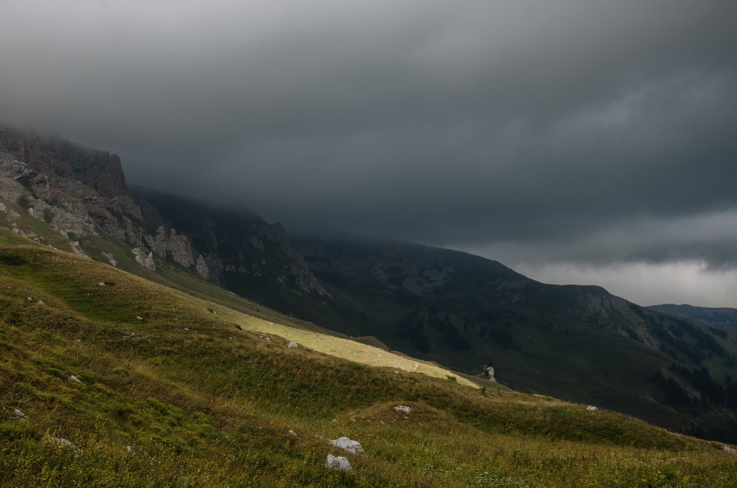 Фишт открылся нам полностью на очень короткий срок. Большую часть времени, что мы его наблюдали, по склонам ползли обрывки туч, сбегавшие с перевала. За горой небо и вовсе было залито свинцом, который казался предельно тёмным и мрачным в силу игры света, — ведь над нами снова выглянуло солнце!