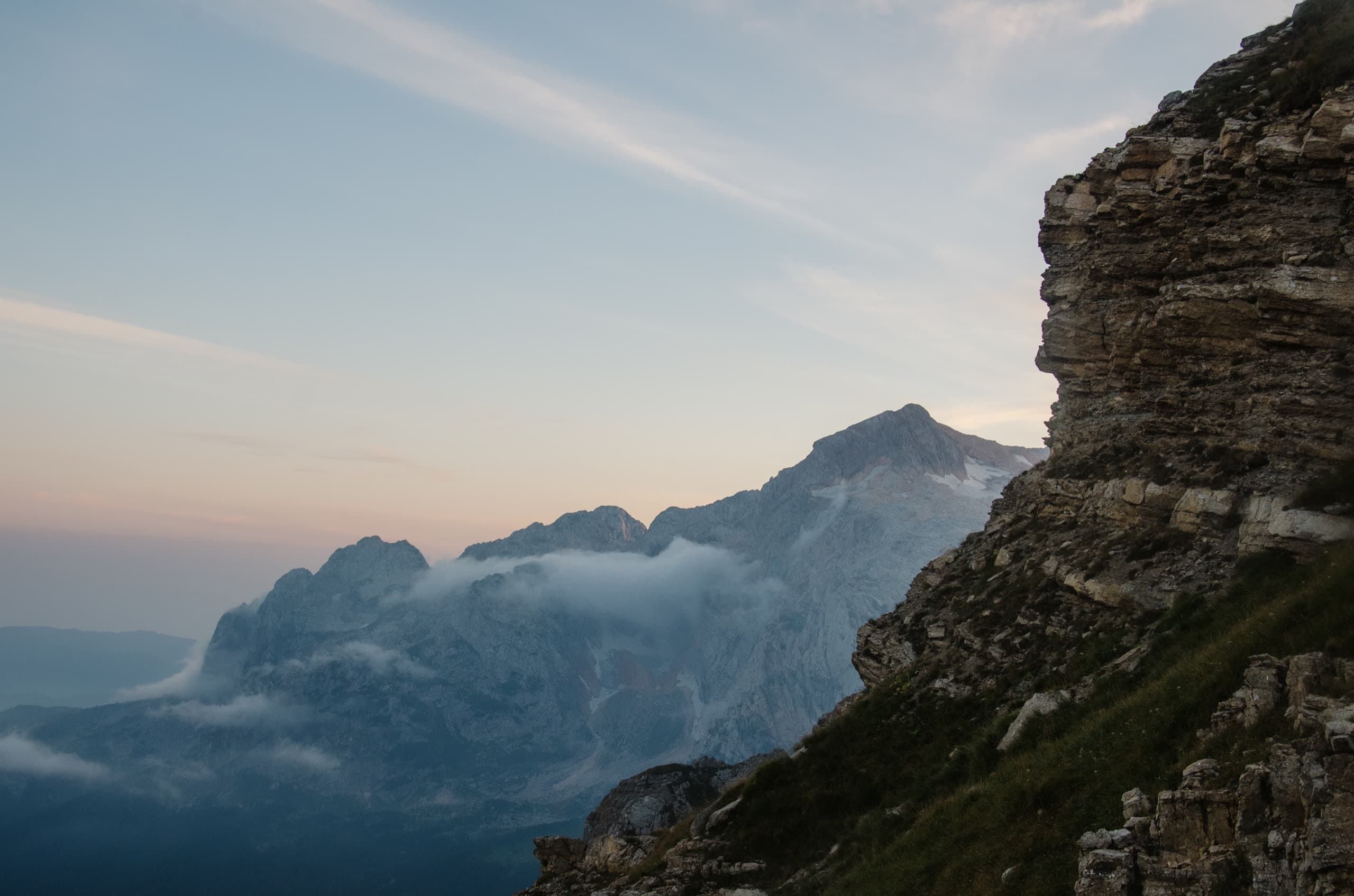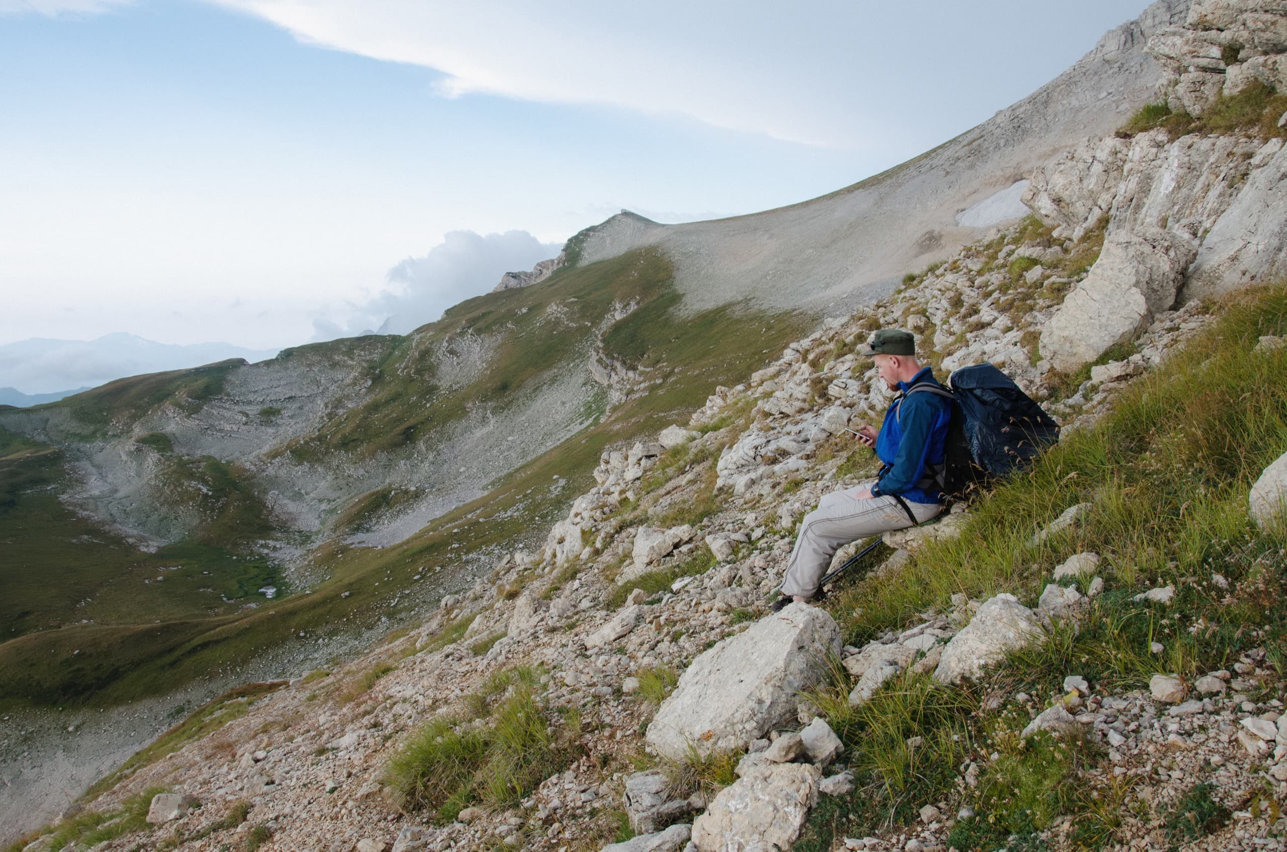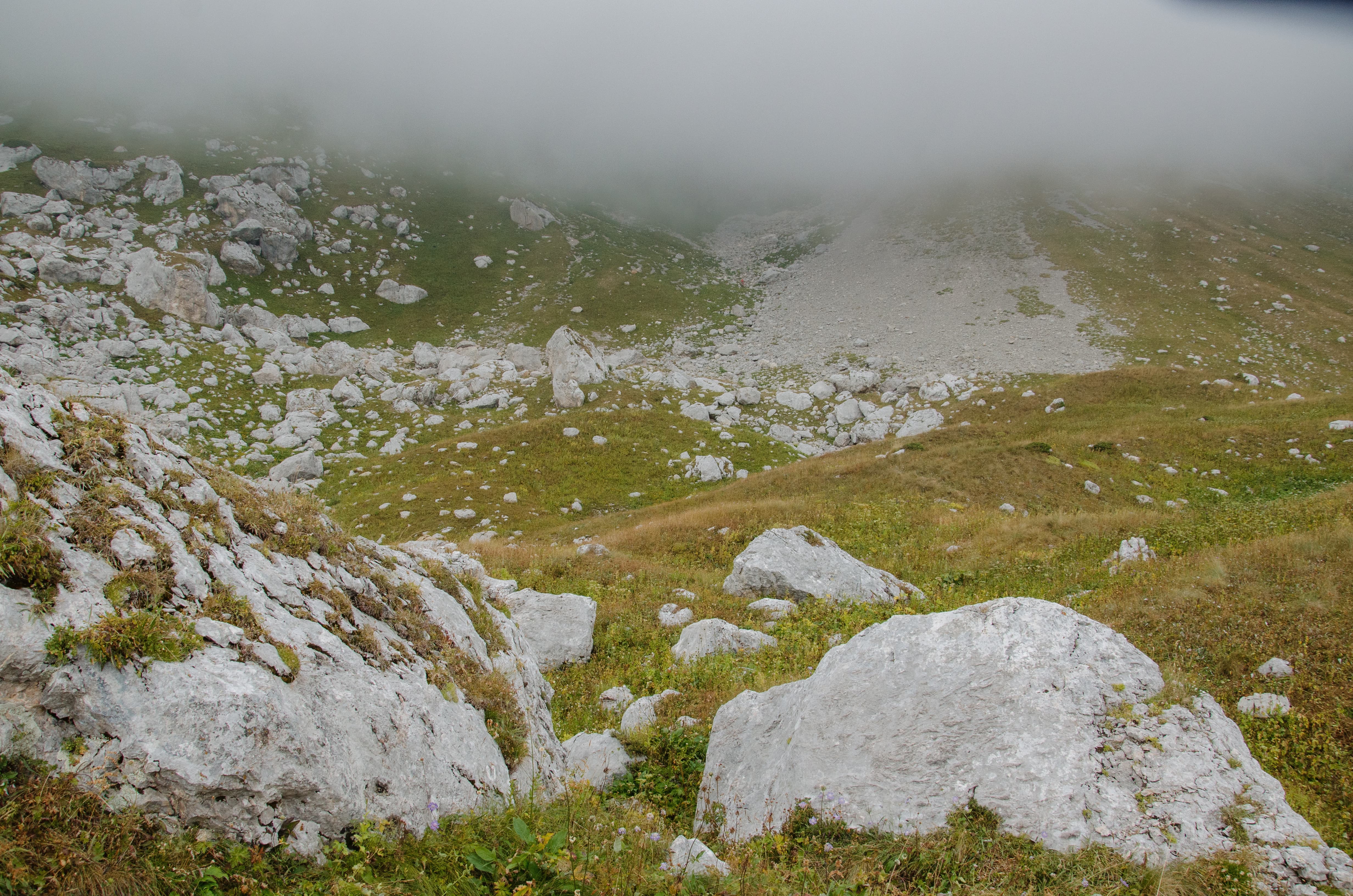 Мы укрылись дождевиками и присели под камнем, образовавшим над нами небольшой карниз. Августовские дожди — это не те затяжные ливни, что терроризируют горы в июне. Этот покапал полчаса и затих. Мы взяли рюкзаки и вернулись к тропе. Балкон, который ещё полтора часа назад был залит солнцем, укутался молочным одеялом — вместе с ним облака скрыли большую часть окрестностей.