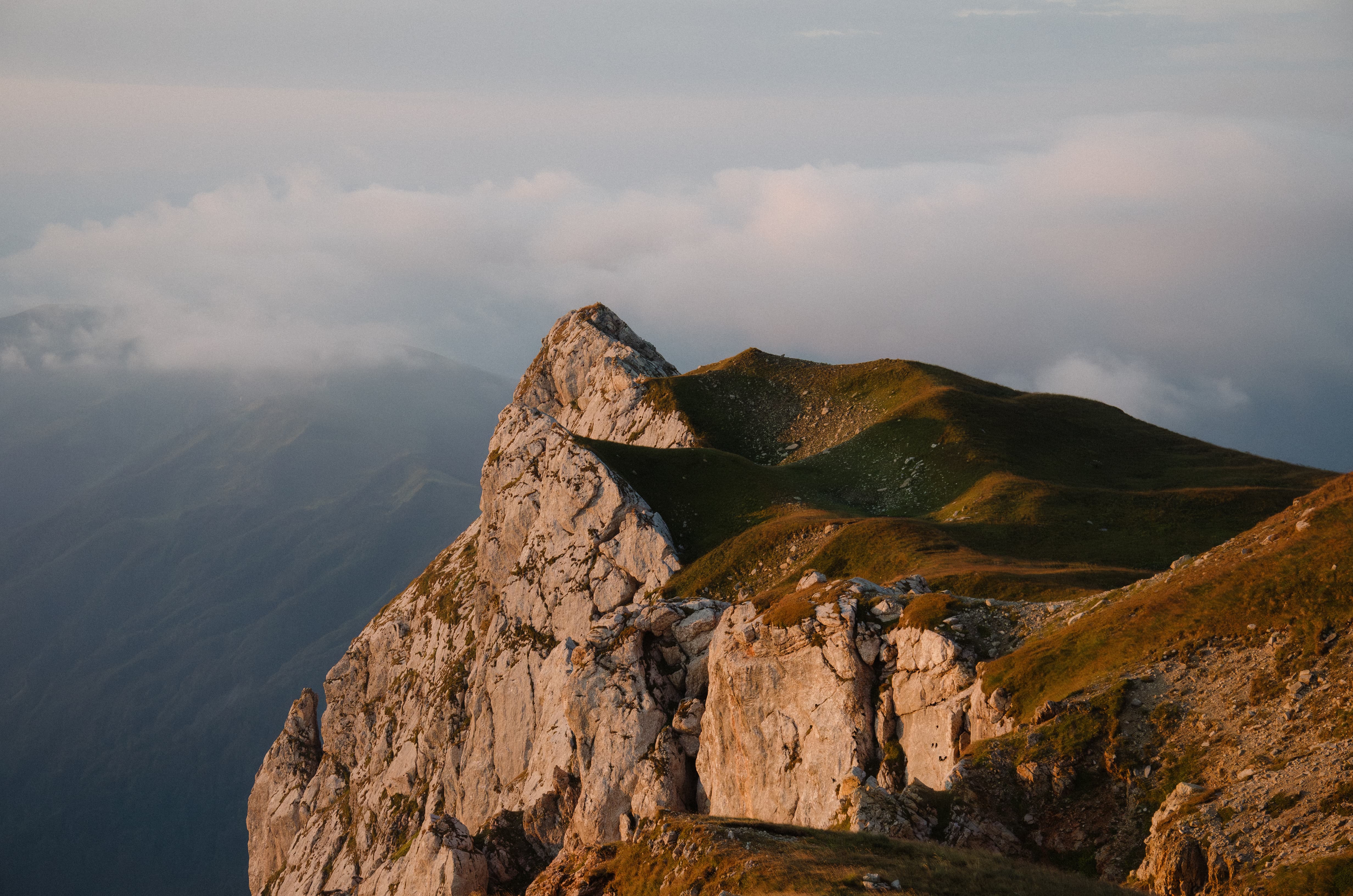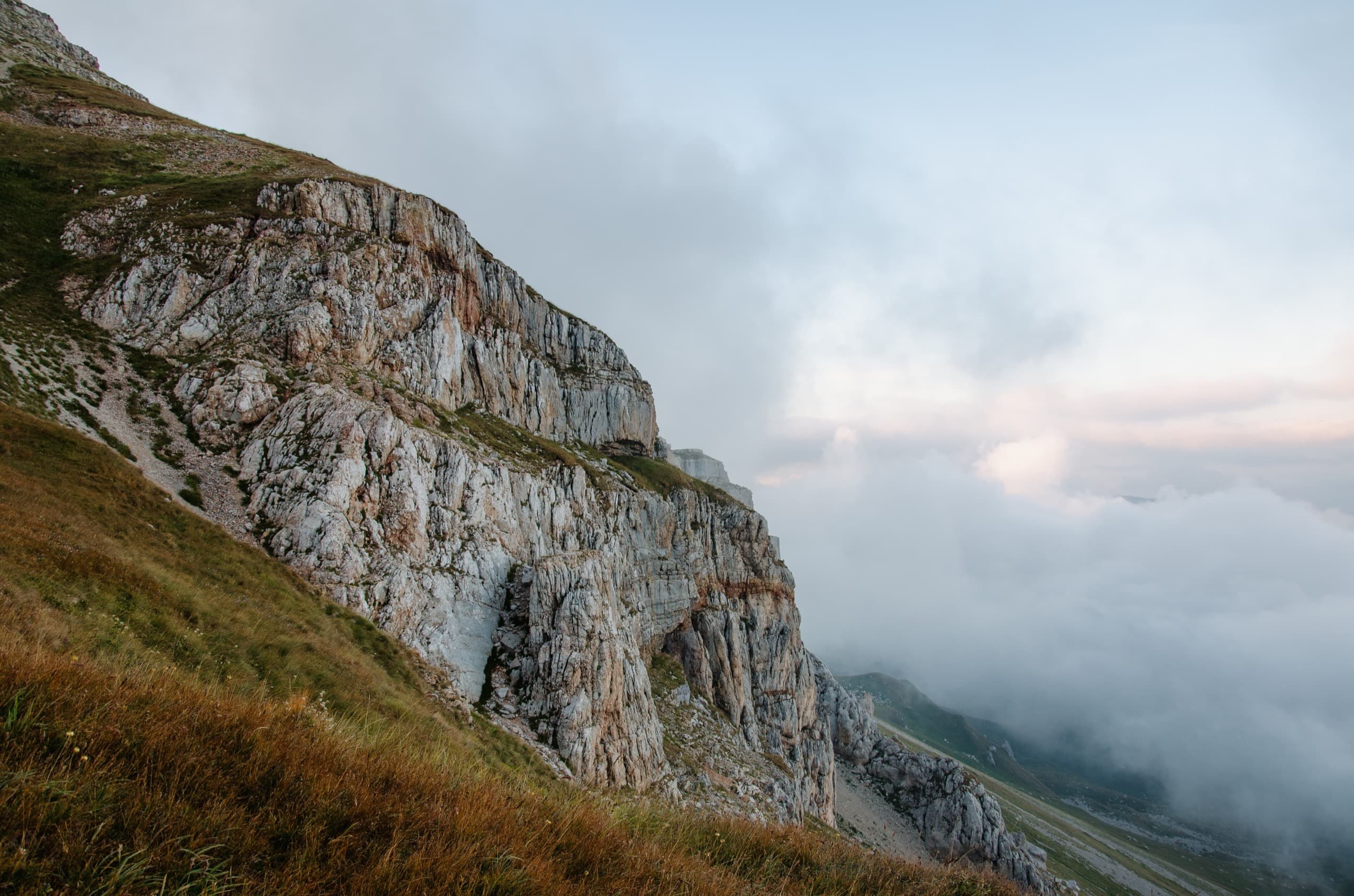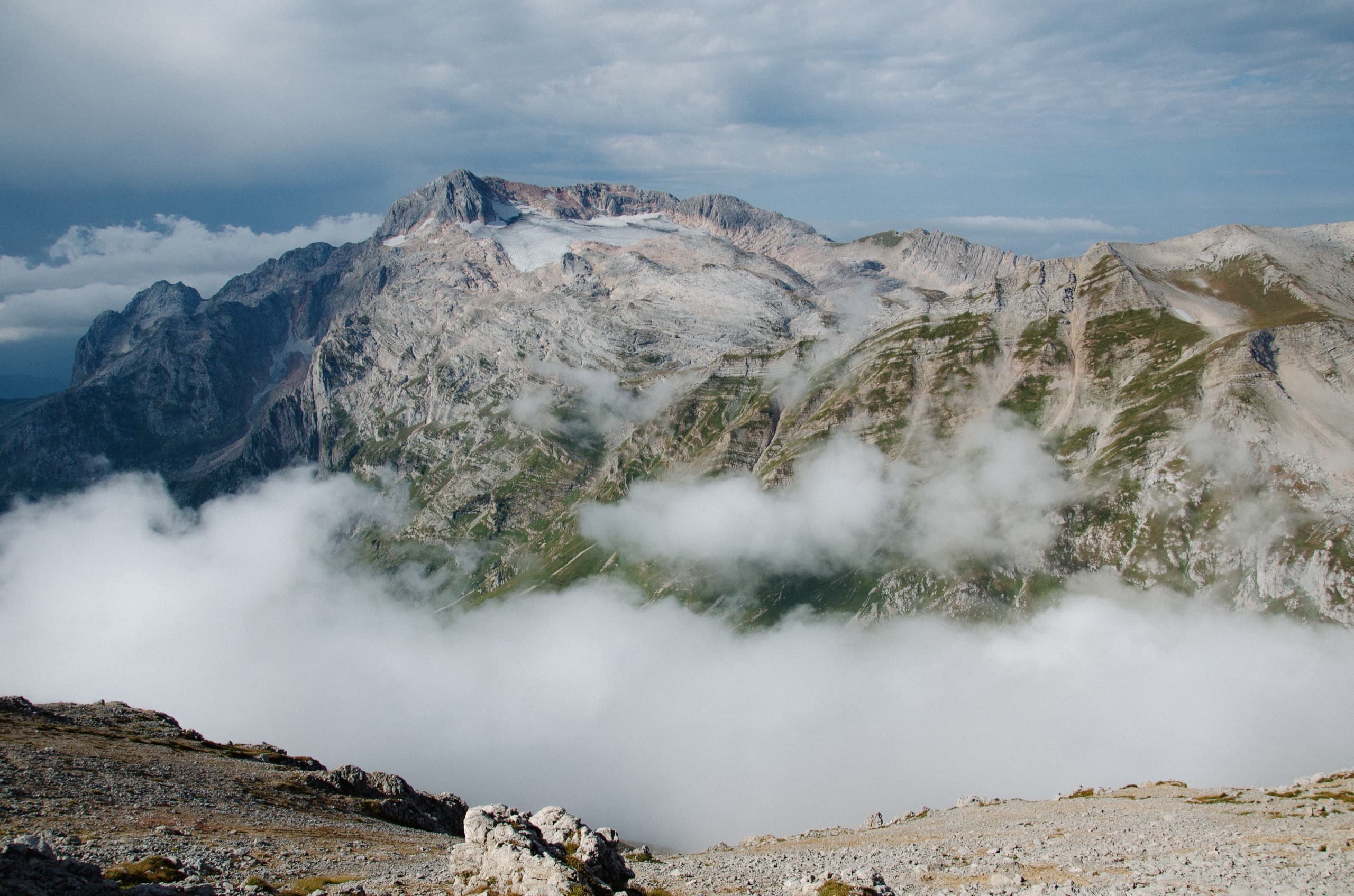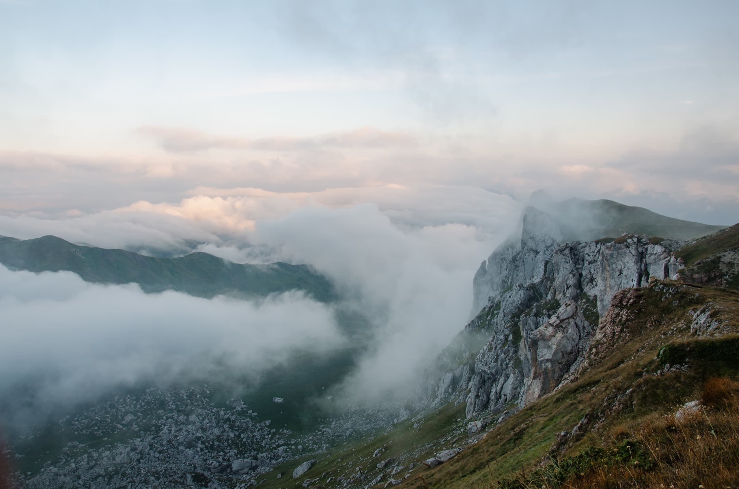 Мы укрылись дождевиками и присели под камнем, образовавшим над нами небольшой карниз. Августовские дожди — это не те затяжные ливни, что терроризируют горы в июне. Этот покапал полчаса и затих. Мы взяли рюкзаки и вернулись к тропе. Балкон, который ещё полтора часа назад был залит солнцем, укутался молочным одеялом — вместе с ним облака скрыли большую часть окрестностей.