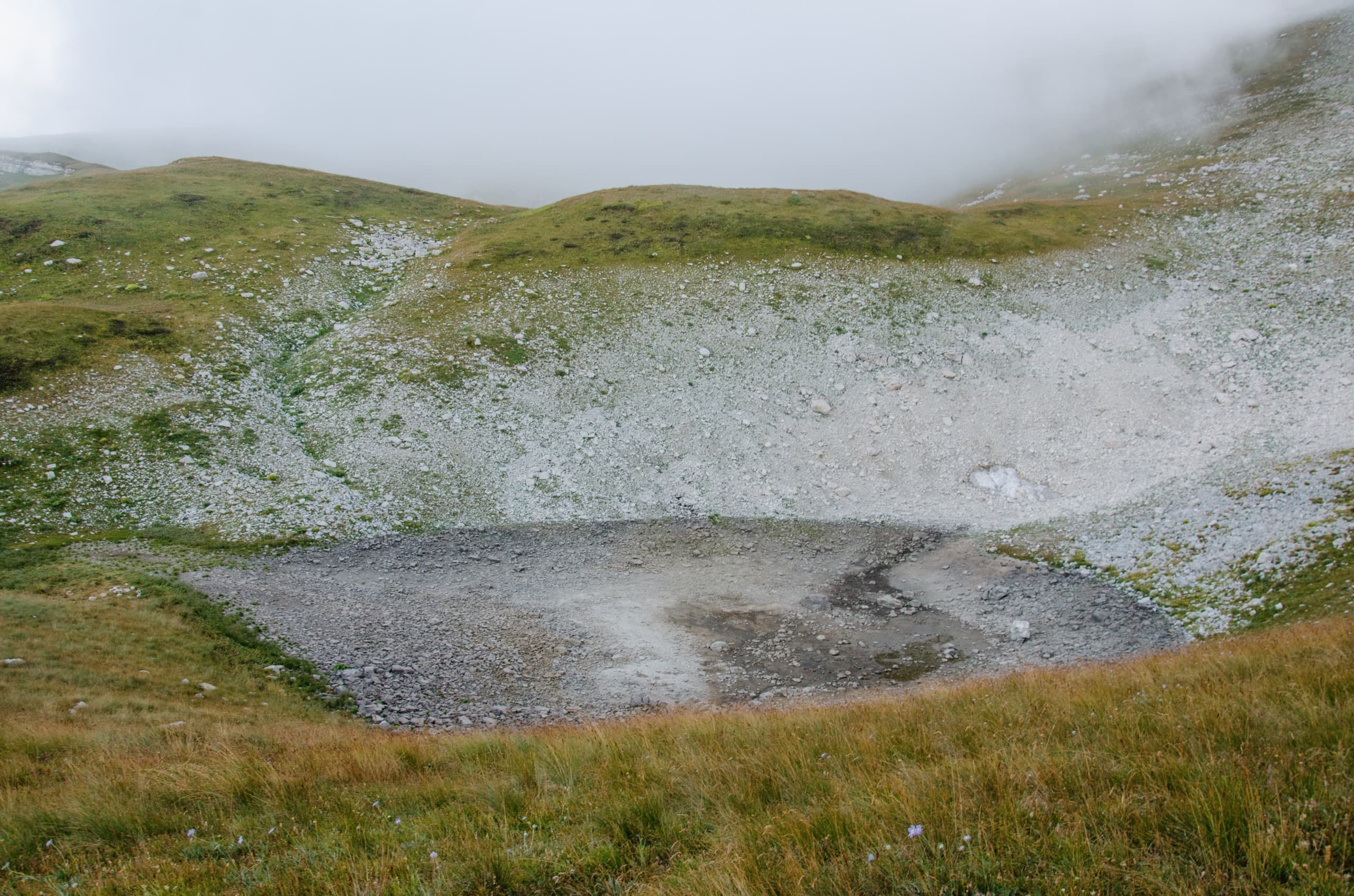 Вокруг висел туман, не было видно ни зги. Мы бросили рюкзаки и пошли к обозначенному на карте озеру. Округлый водоём диаметром около полусотни метров оказался пересыхающим. Его глинистое дно уже успело подсохнуть, и только в самом центре серебрились пара лужиц.