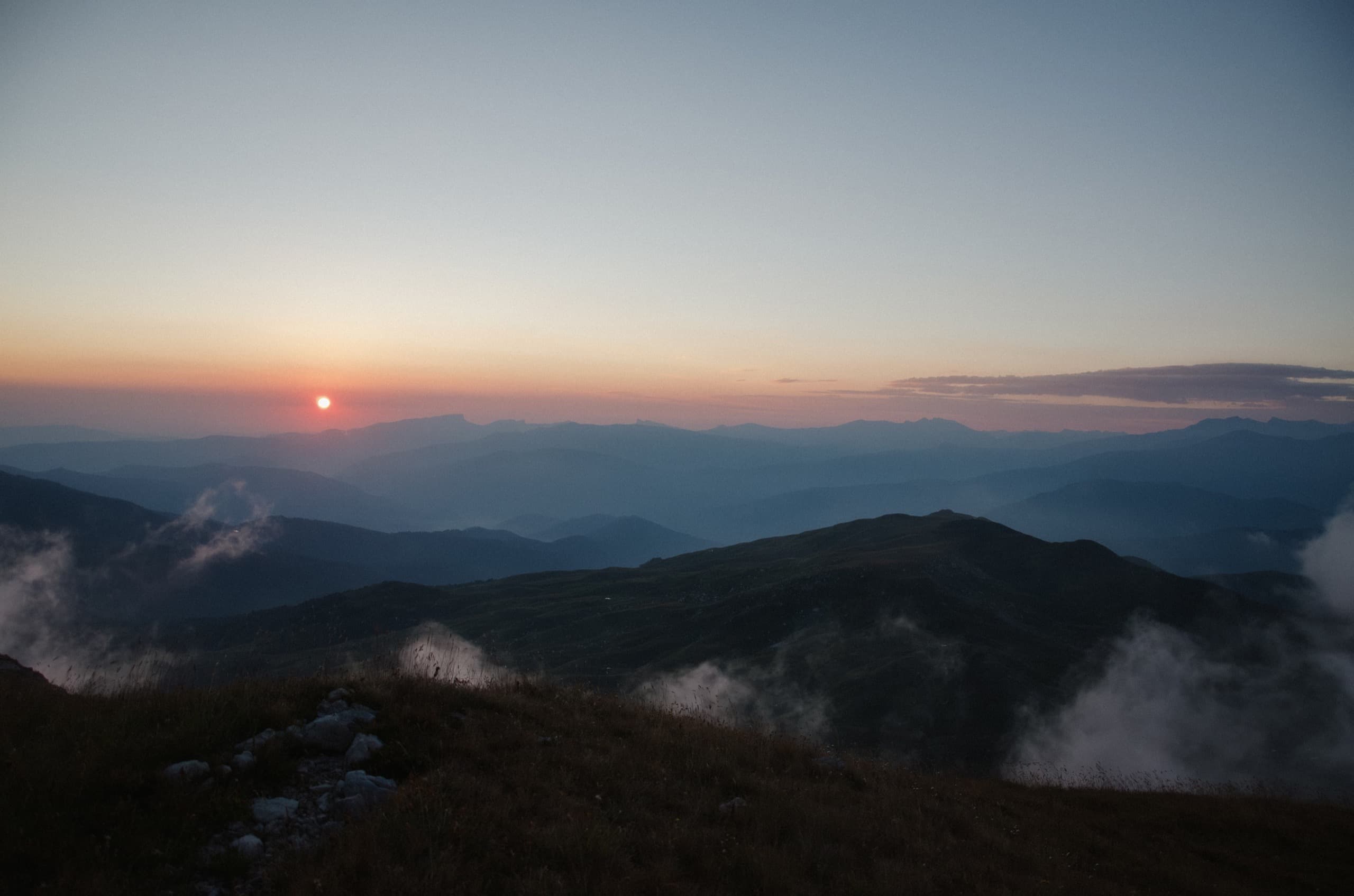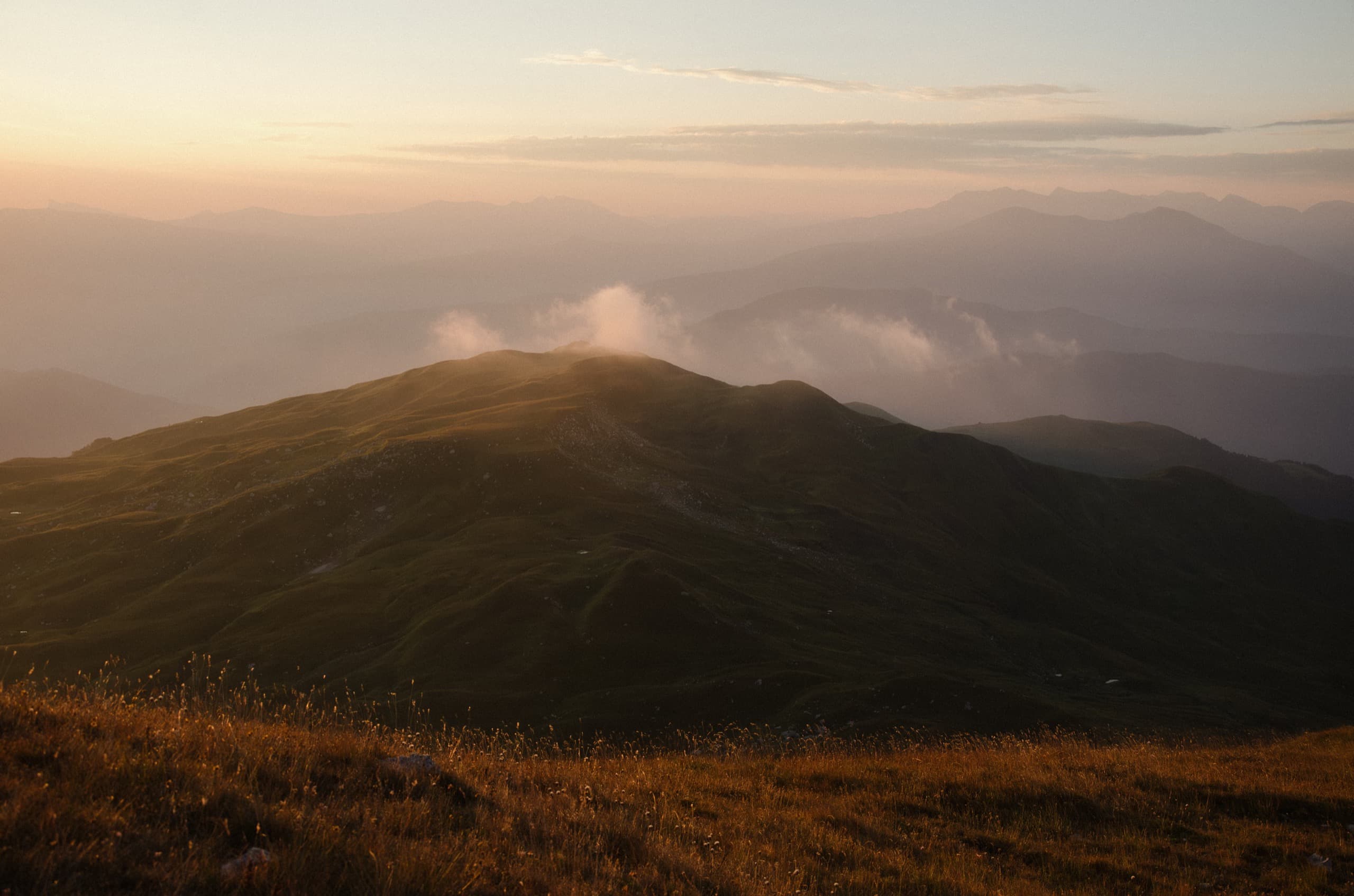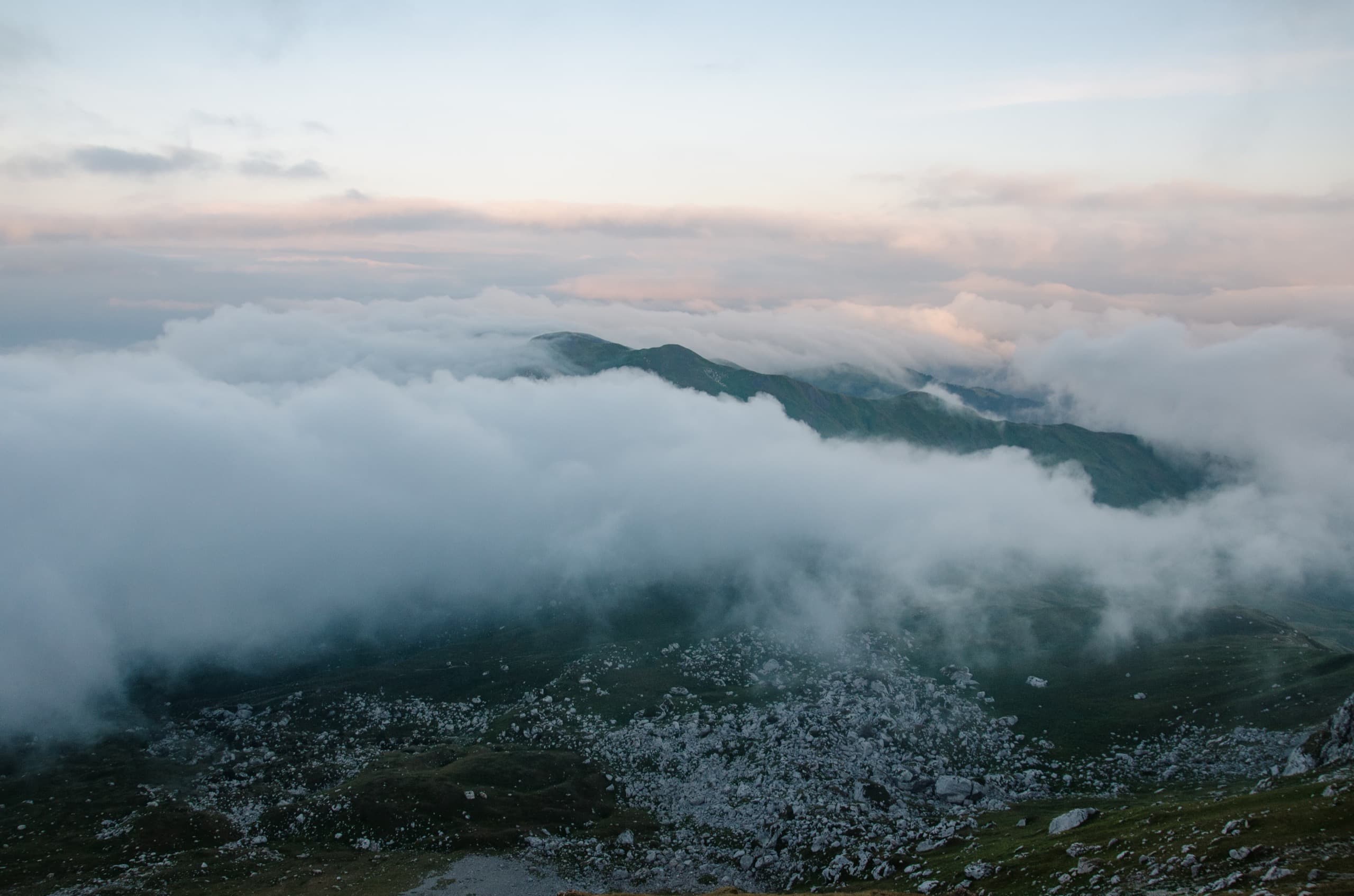 Многие из окрестных склонов всё ещё были скрыты в облаках, падавших в низины. Мы стояли в тени, поэтому тучи поближе были иссиня-белые и темнели с каждой минутой (дело шло к закату). А вот туманный ковёр вдали, наоборот, всё сильнее разгорался розово-жёлтыми красками заходящего солнца.