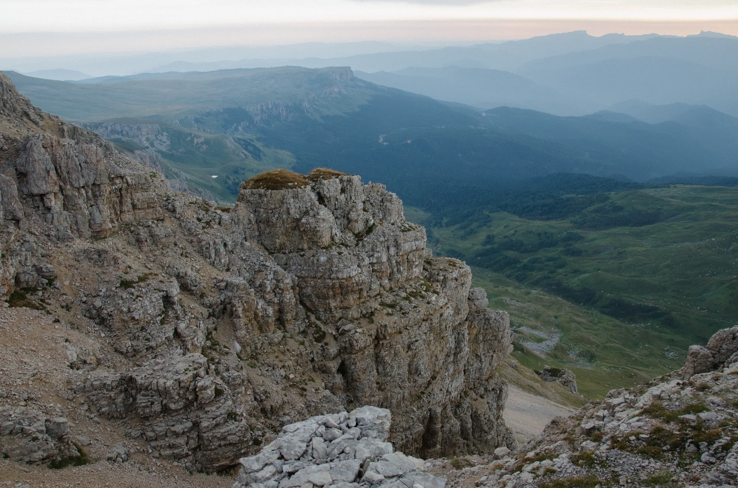 Порадовал маршрут через «балкон». Всё-таки подъём мимо Бляма уж слишком матрасный, а тут и есть на что посмотреть и где напрячься. Стало интересно пройти по маршруту от вершины к озеру Псенодах или к Фишт-Оштеновскому перевалу. Судя со стороны, эти маршруты должны быть ещё любопытнее и сложнее. Ну что же поводов вернуться на массив ещё полно — Фишт с Пшехой так-то ещё совсем не топтаны.
