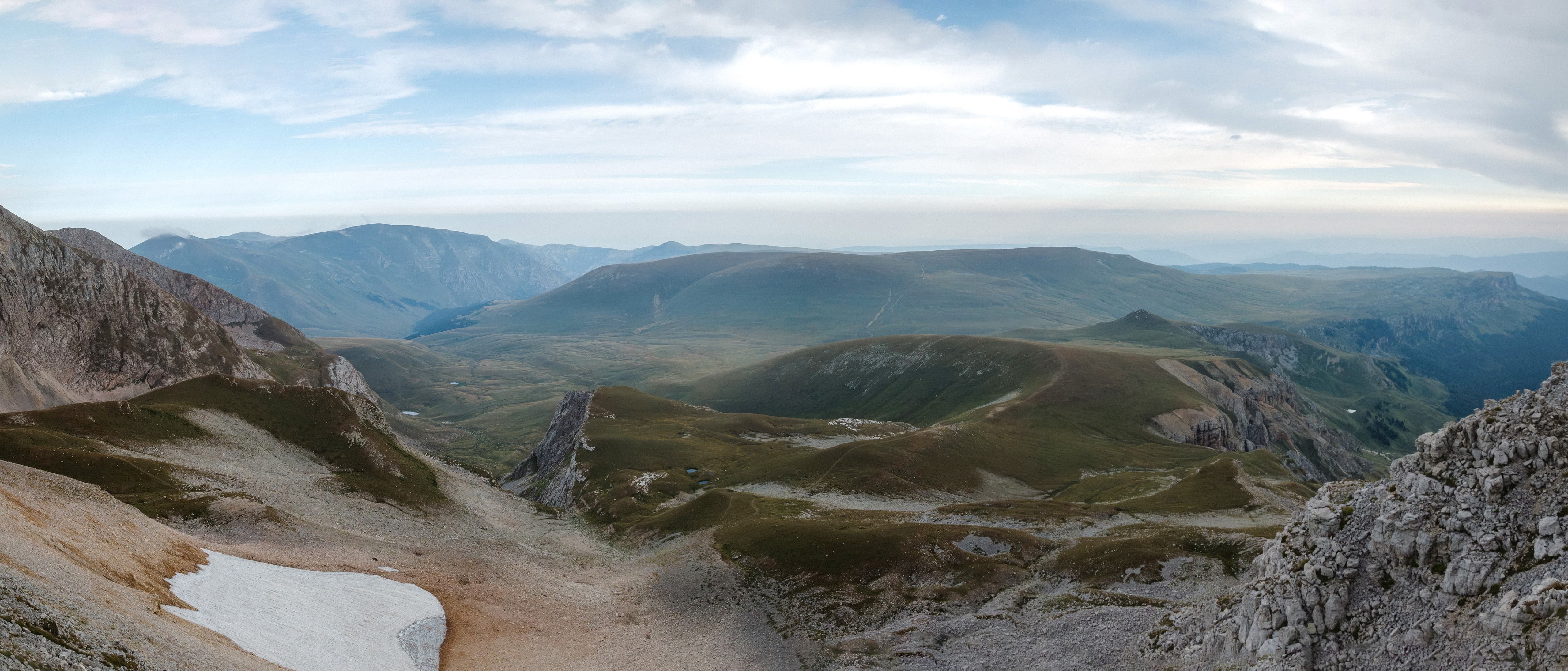 Прогулявшись вокруг озера, вернулись к рюкзакам и стали присматривать место для лагеря. Тут облака разорвались и открыли взору панораму балкона и окружающих его склонов.