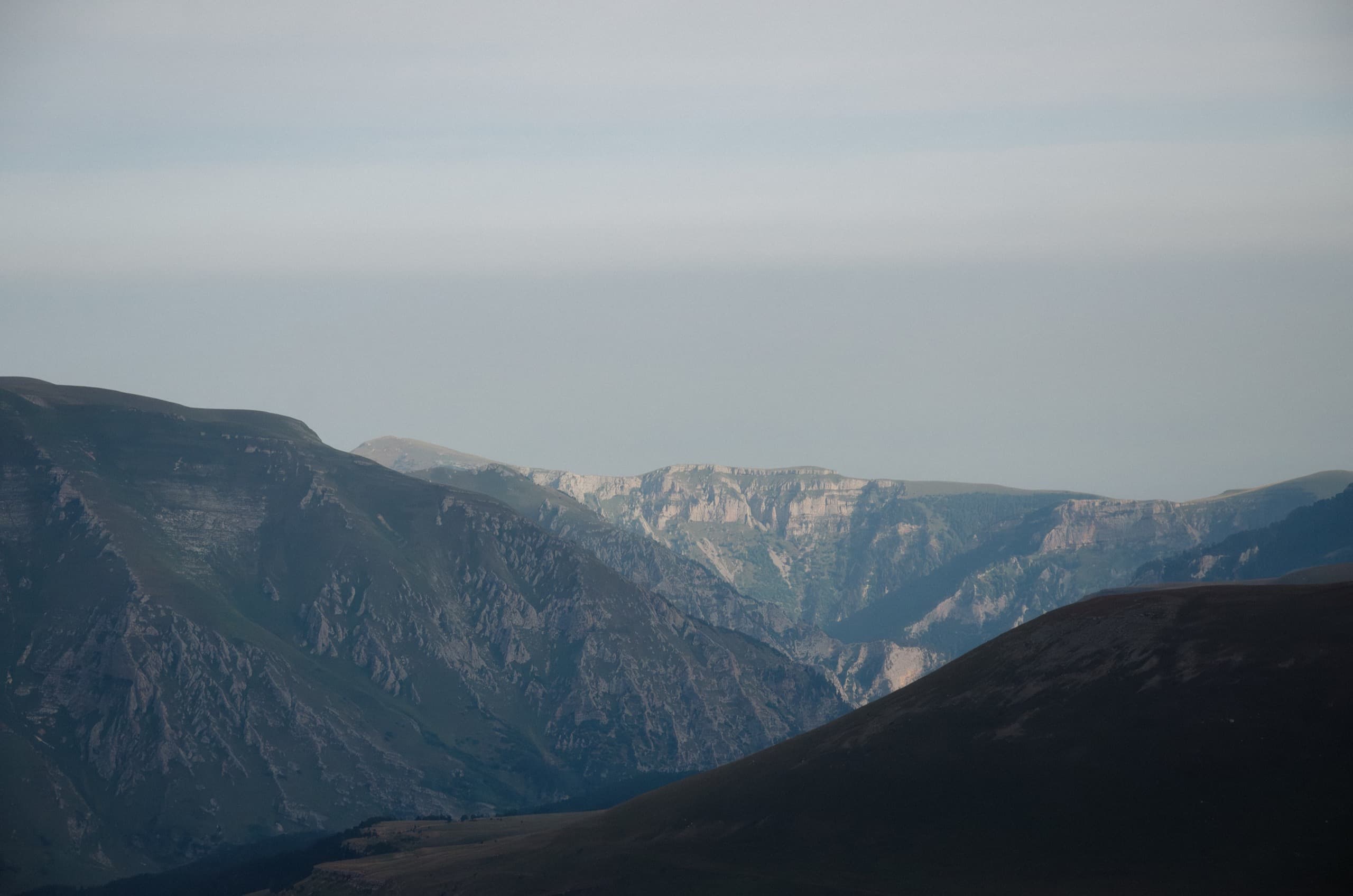С востока до самого горизонта просматривалось слоистое полотно заповедных хребтов. Летняя дымка скрывала от глаз детали и оставляла только синевато-серые силуэты, наслаивающиеся друг на друга. Долины между ними выглядели светлее вершин — там ещё оставался утренний туман.
