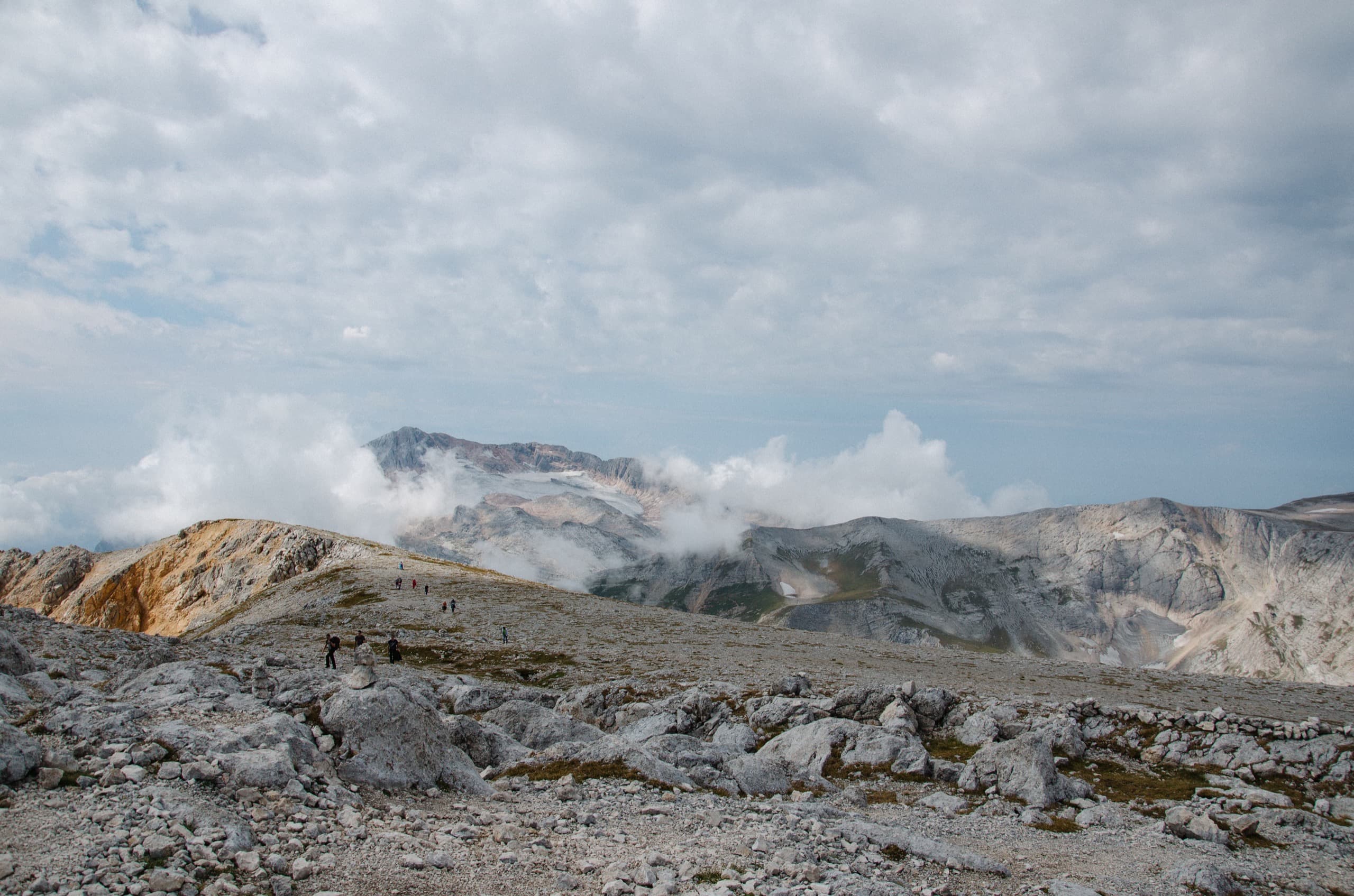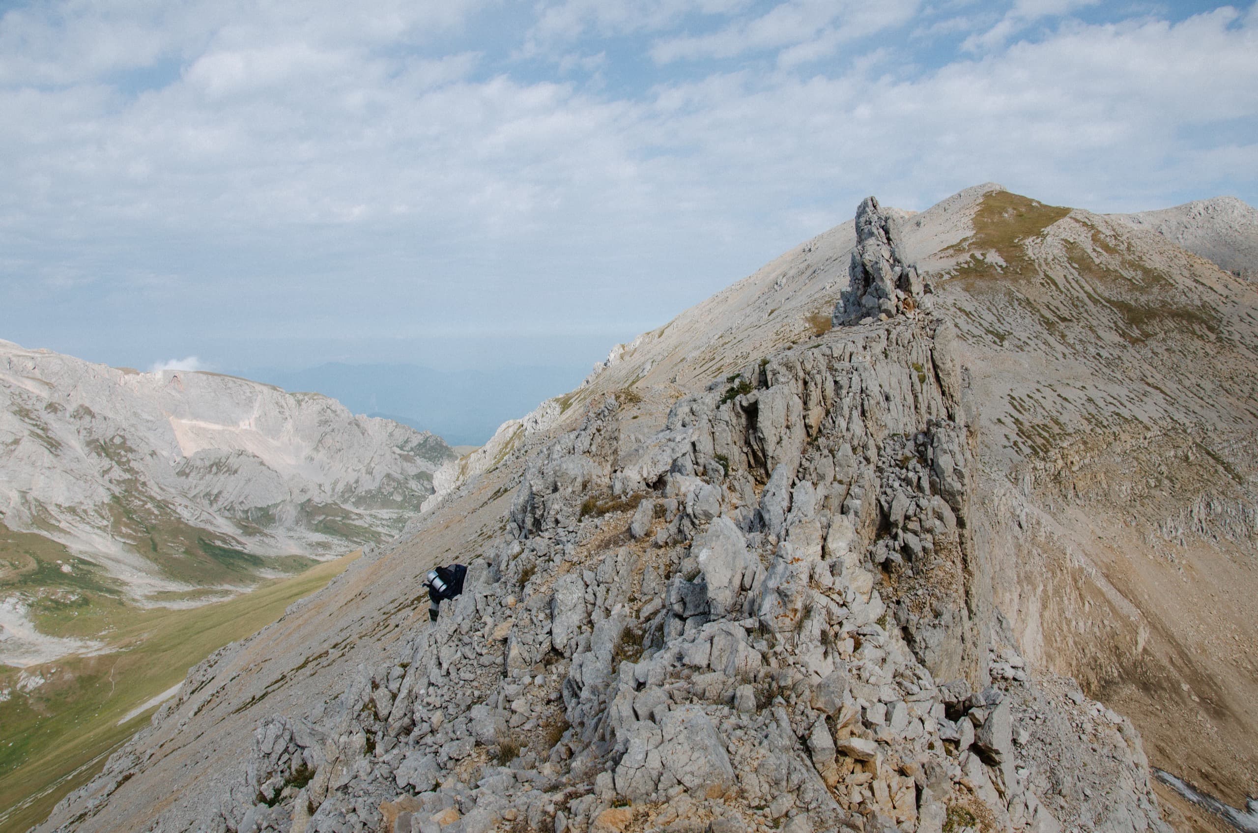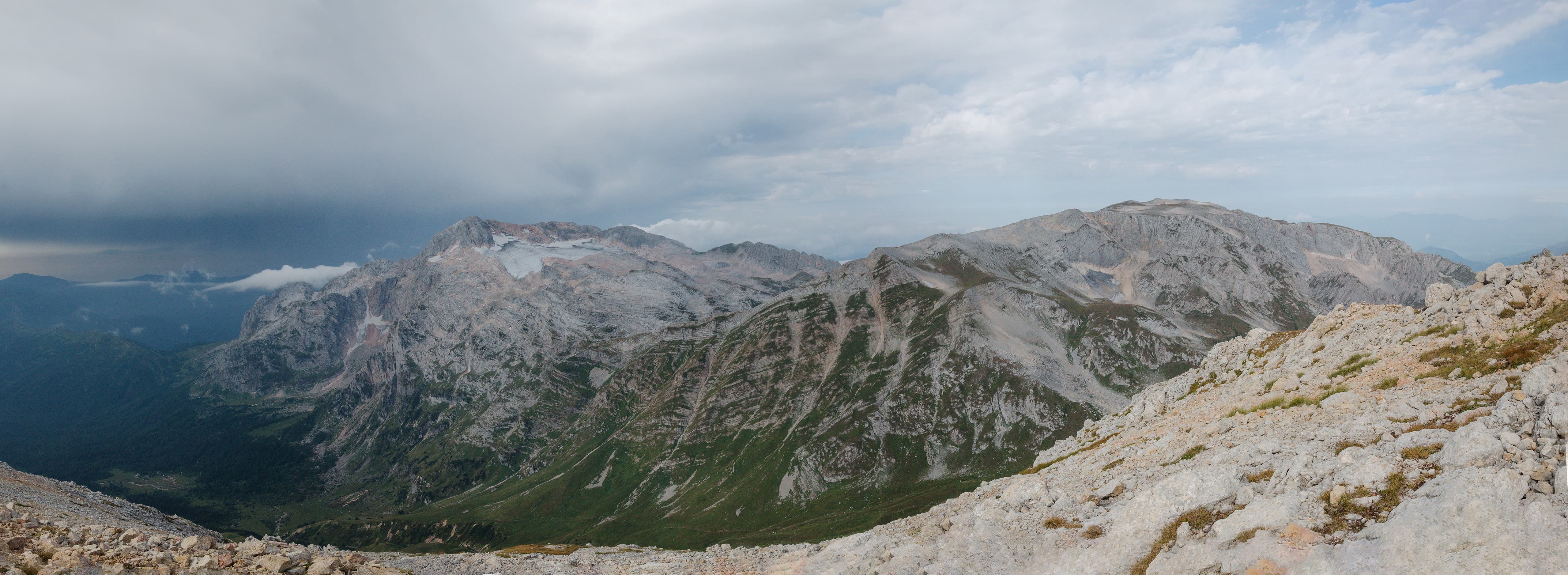 Луг закончился, направление вело вверх по склону, через обширную морену. На камнях заметили две спускающиеся фигурки (пробую показать масштаб — попробуйте их найти на следующей фотографии). Мы остановились, подождали. Парень с девушкой шли налегке. Они одним днём пробежали через Оштен и теперь возвращались на Яворову поляну. Ребята поделились с нами бутылкой воды, чем несказанно выручили. Если вы прочитаете эти строки, то я вам до сих пор благодарен за ту бутылку!