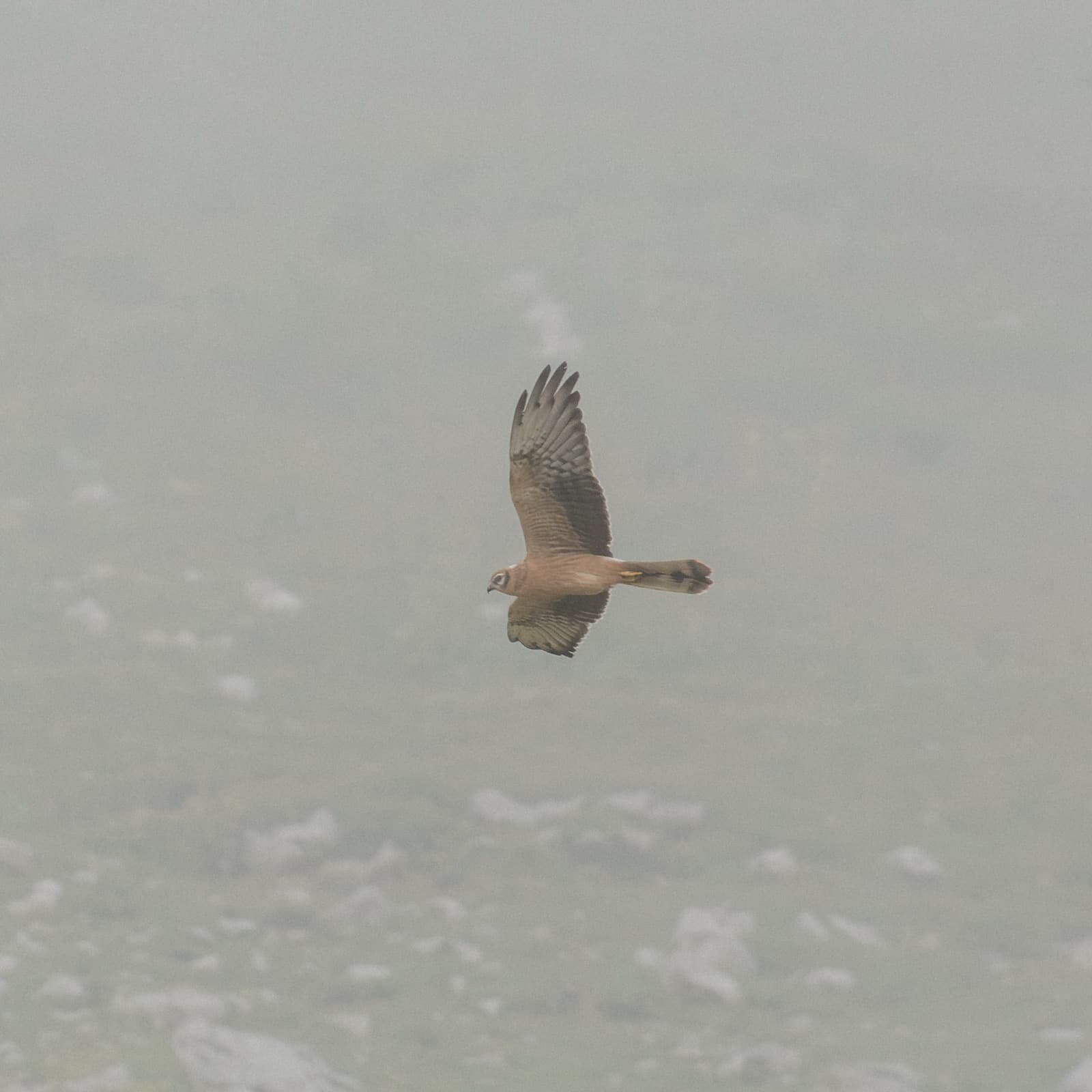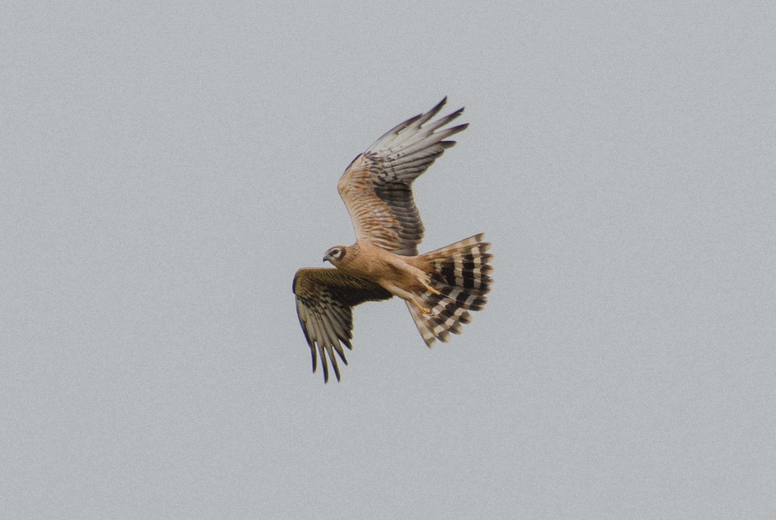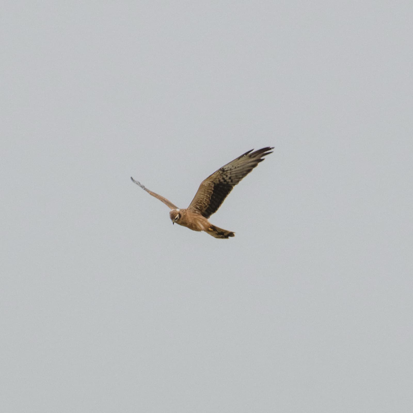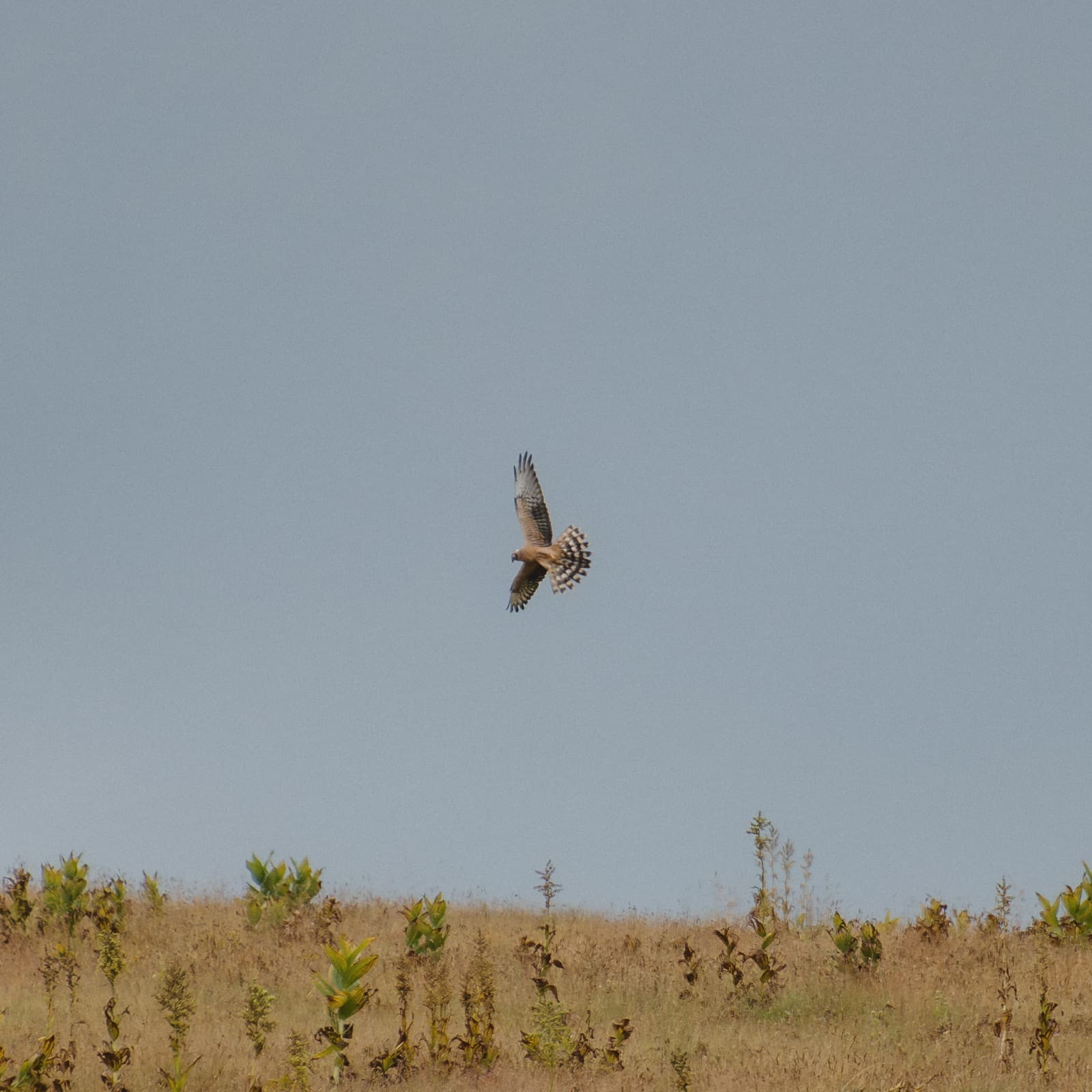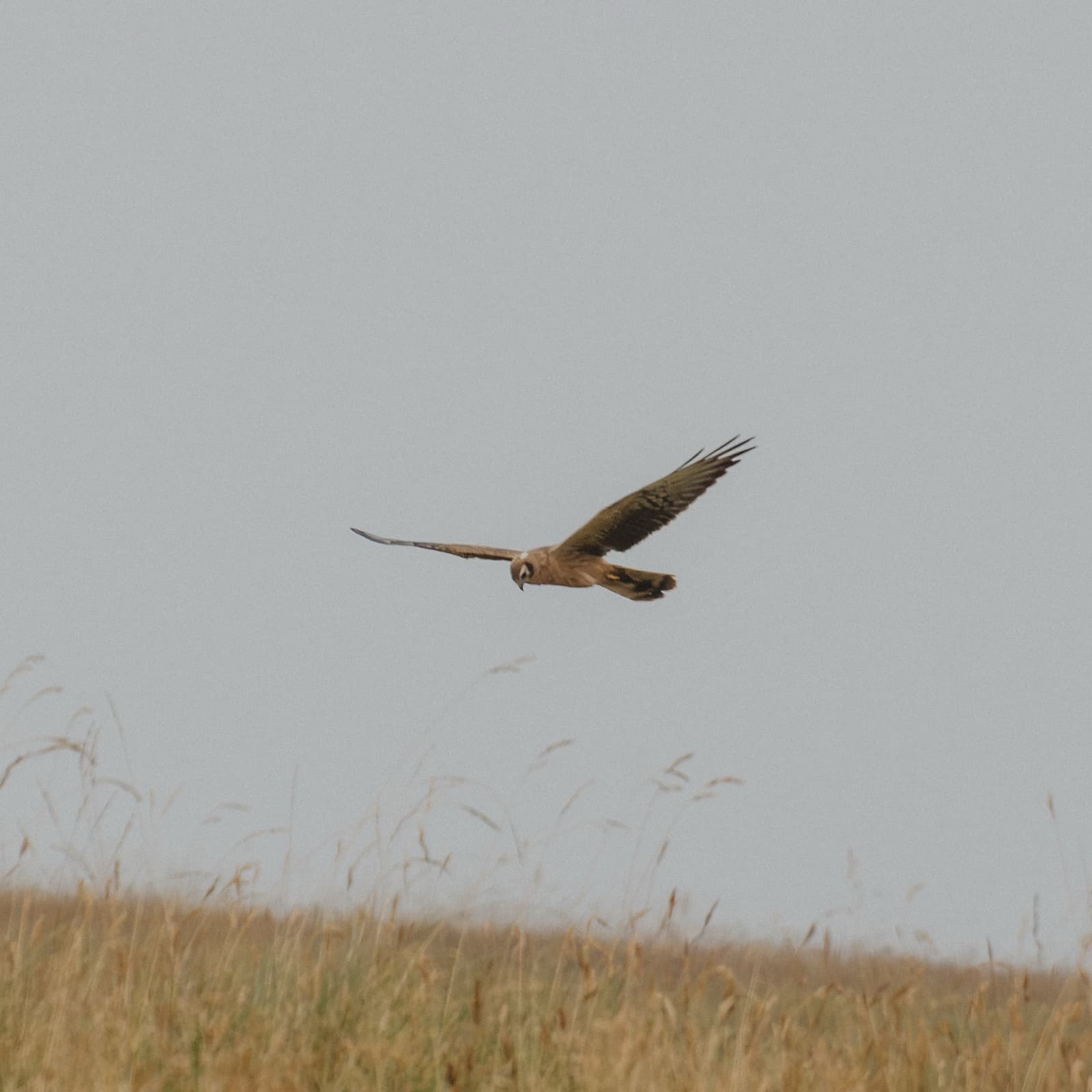 В моменты просветов выходили гулять вокруг палатки, да пили чаи на свежем воздухе. В одну из таких вылазок я увидал её, самку полевого луня. Будто строго по расписанию нарезала она широкий овал вокруг нас, в определённых местах ненадолго зависала, что-то высматривала, изредка пикировала в траву, но чаще летела дальше. Кругу к третьему я окончательно приметил график полётов, взял телеобъектив и залёг у места ближайшей от палатки остановки, пока хозяйка охотничьих угодий была на дальнем конце. Расчёт оправдался, с точностью до минуты охотница приблизилась, и не обращая внимания на ярко-оранжевое пятно в траве (то есть меня), зависла, где и ожидалось, подарив очень хороший кадр.