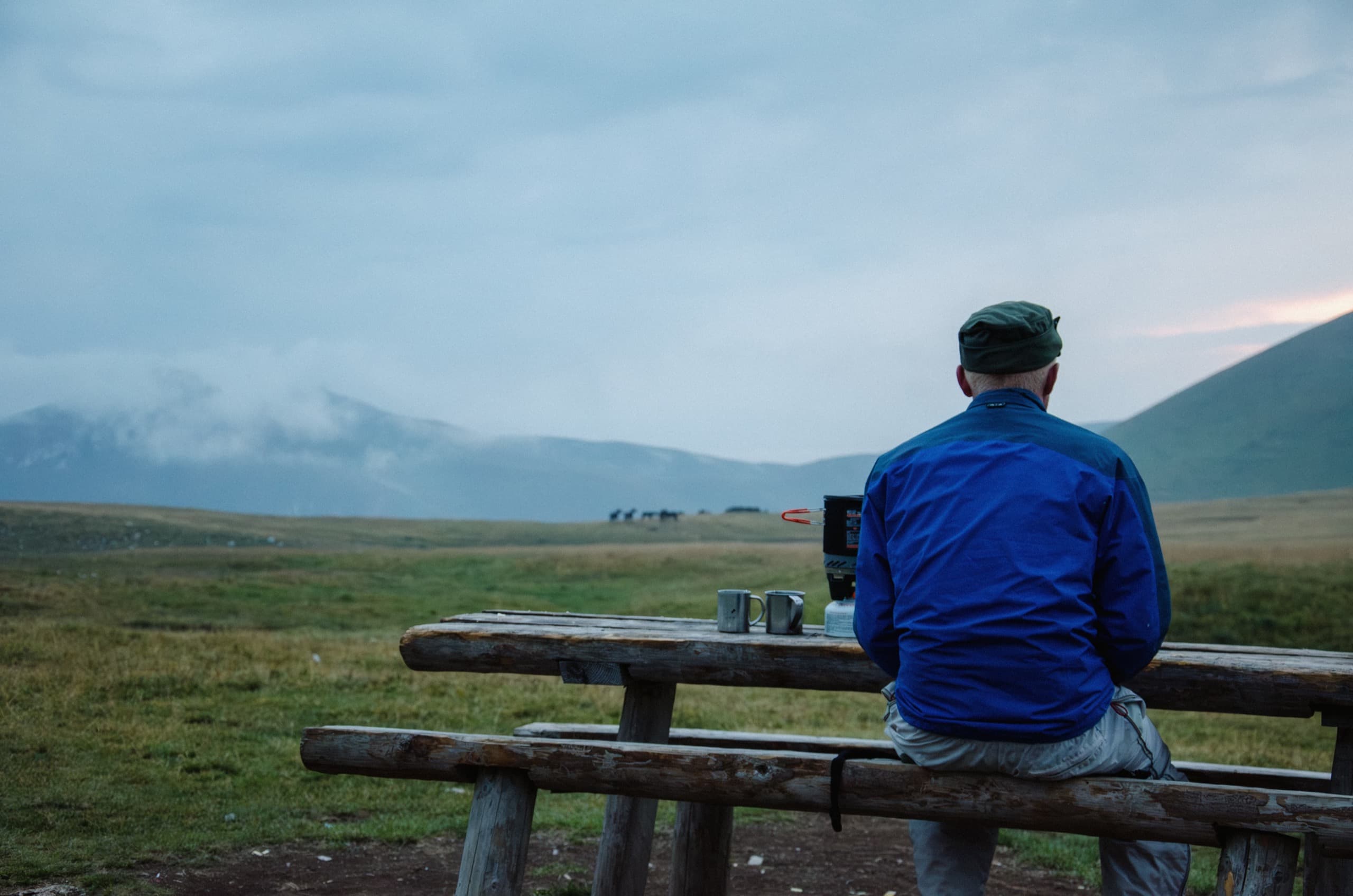 Неподалёку от палатки, по другую сторону тоненького ручья, нашего источника воды, стоял деревянный стол, с двумя лавками. Установили его, наверное, пастухи. Туда мы и пошли на последнее вечернее чаепитие. Облака к вечеру так и не расступились, но снова открылся взгляду Оштен и долина, уводящая к Псенодаху. Там на пригорке гарцевал табун. Бегали, гонялись друг за другом кони, а мы наблюдали, наслаждаясь ароматным напитком.