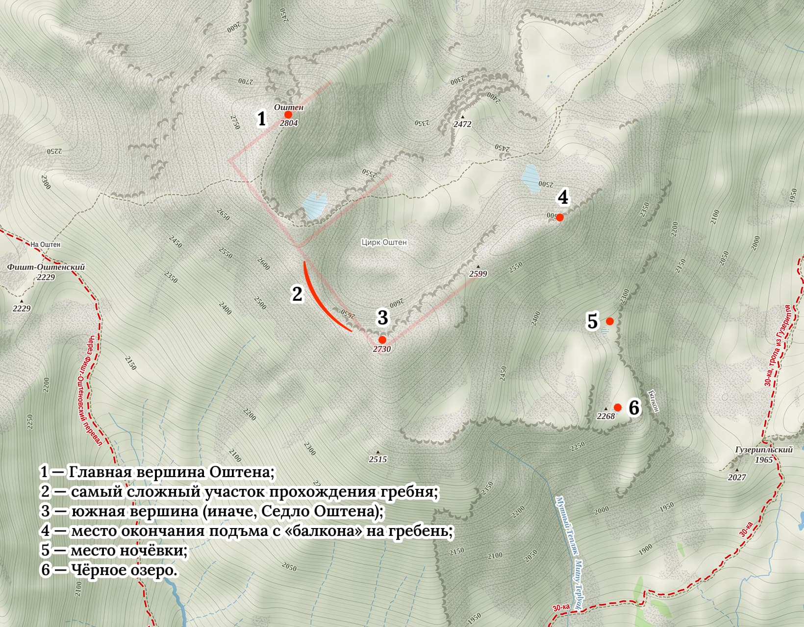 Классический маршрут подъёма на гору проходит через Блям, небольшой холм на северных отрогах. Так мы поднимались в июне. В этот же раз я не захотел идти традиционным путём и предложил вариант захода через так называемый «балкон» Оштена, расположенный на юго-восточных отрогах горы.