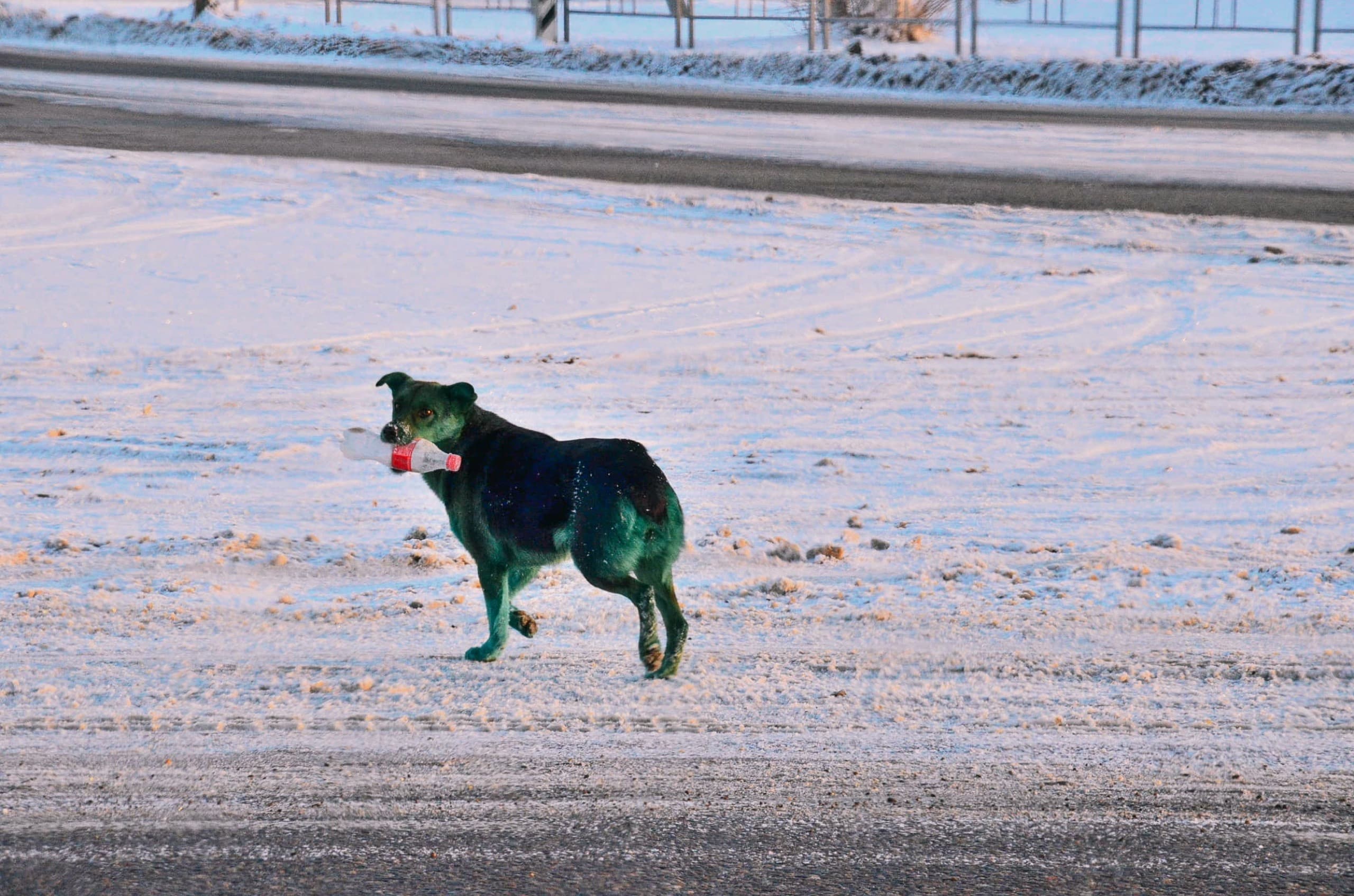 На одном из светофоров дорогу перебежала зелёная(!) собака с пустой бутылкой из-под колы в зубах. Немая сцена. Едем дальше.