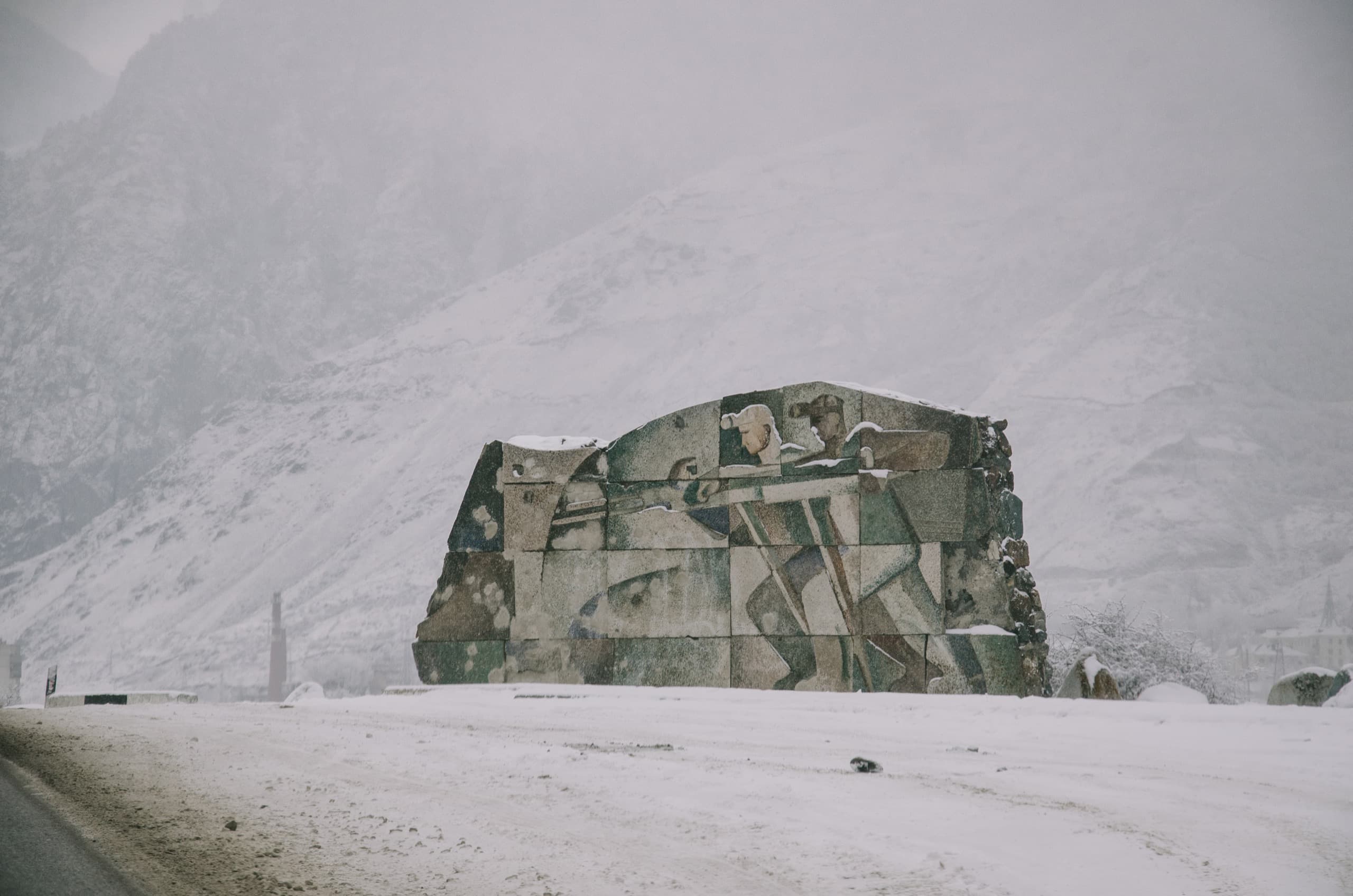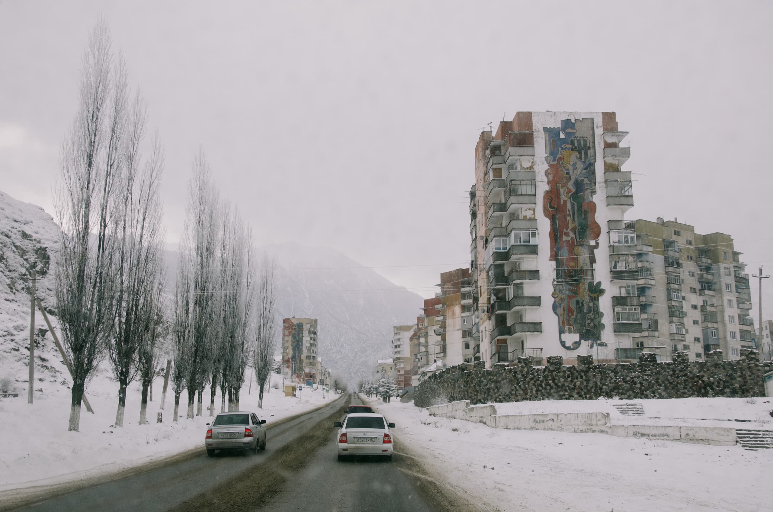 Но несмотря на витающий дух разрухи, мне Тырныауз приглянулся, насколько может приглянуться город, который ты осматриваешь из окна автомобиля. Есть гармония в каменных жилых высотках, многие из которых украшены живописными панно, и километровыми стенами гор, сжимающими город с обеих сторон.