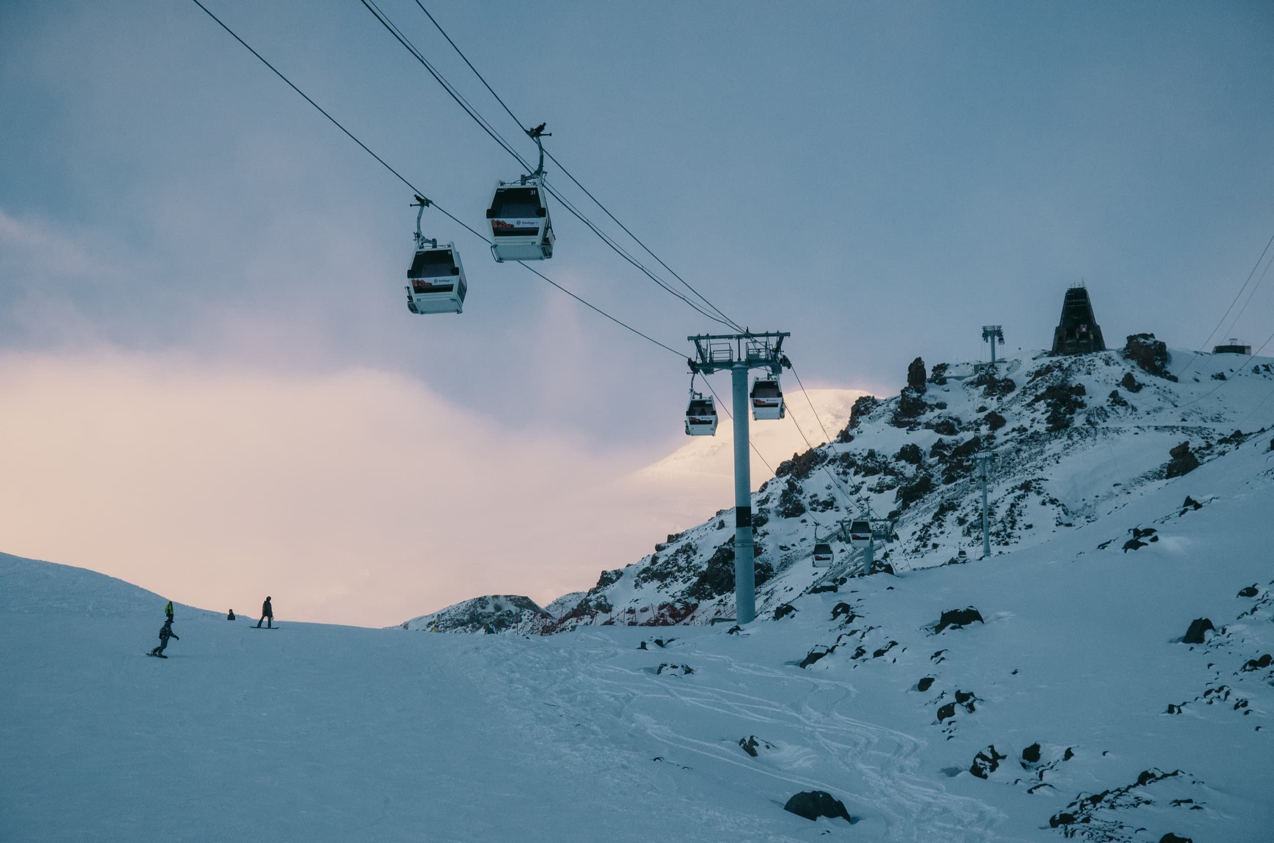 Шустро заселились, взяли в прокате доски и другое снаряжение и помчали на поляну Азау. Солнце снова сменилось хмурым небом. Как там наверху будет?